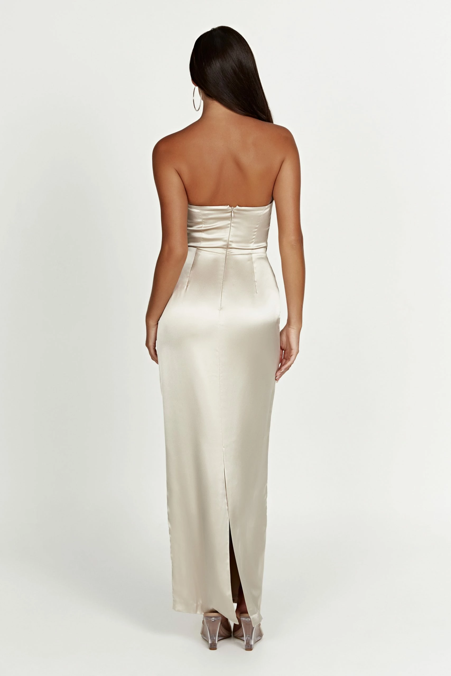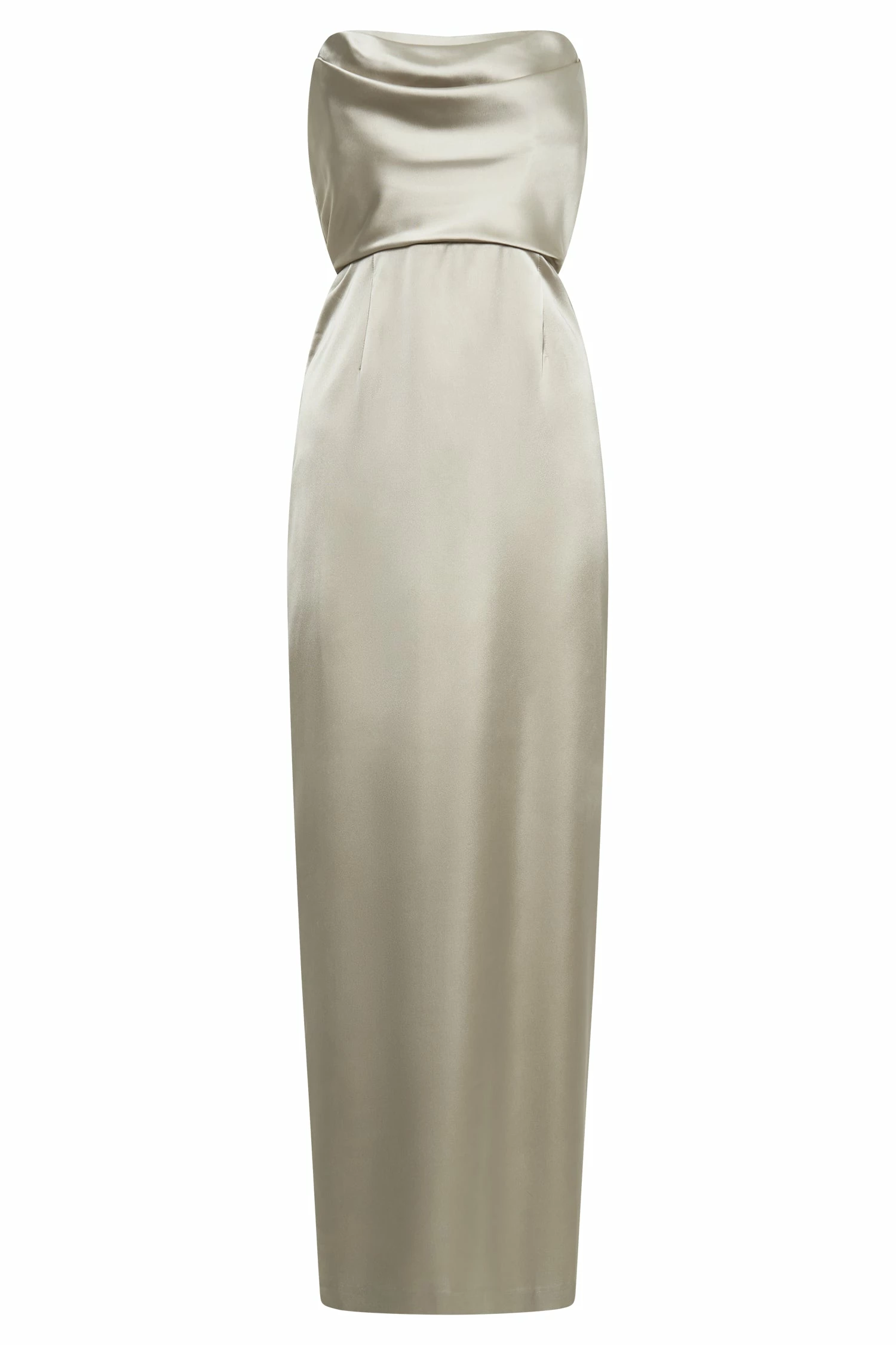 The ALANIS Strapless Maxi Dress invokes cinematic glamour. It is fully lined and has a romantic cowl neckline in a strapless design. Crafted from a luxurious satin fabrication, it features boning at the bodice for an added touch of support. The centre back invisible zipper creates a concealed closure while the centre back vent on the skirt allows for extra movement. Wear with our Brandy Ankle Strap Heels to complete the look.