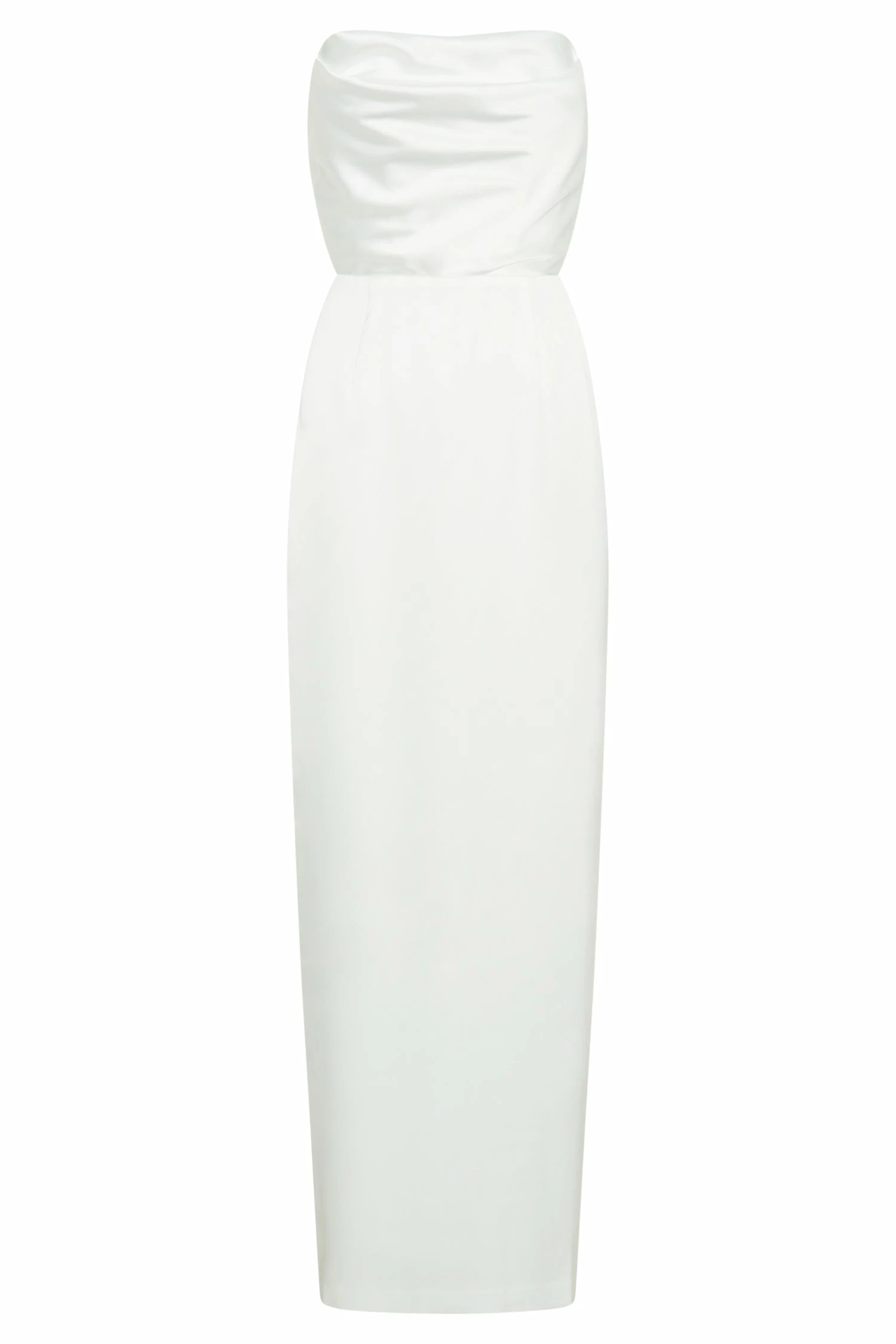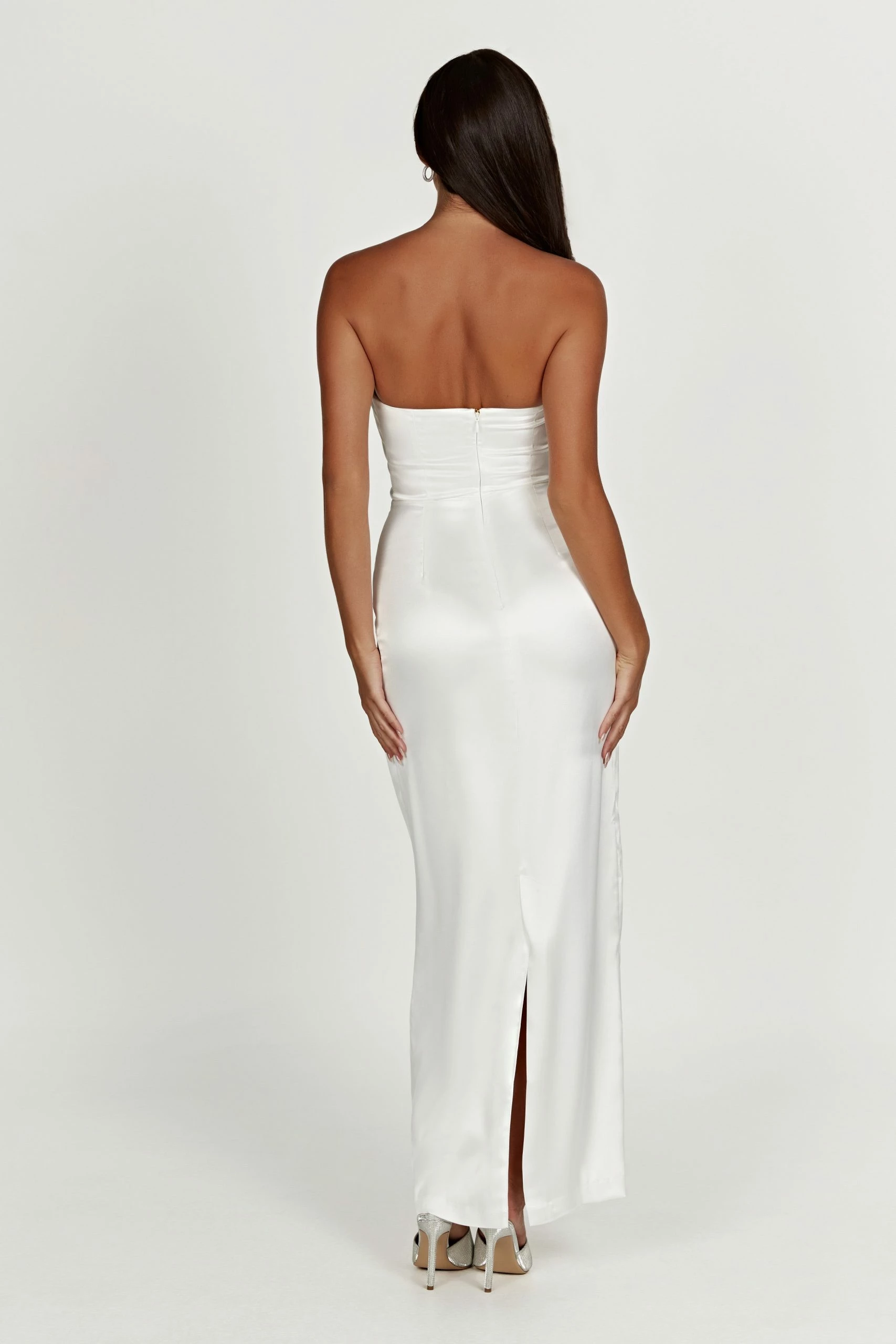 The ALANIS Strapless Maxi Dress invokes cinematic glamour. It is fully lined and has a romantic cowl neckline in a strapless design. Crafted from a luxurious satin fabrication, it features boning at the bodice for an added touch of support. The centre back invisible zipper creates a concealed closure while the centre back vent on the skirt allows for extra movement. Wear with our Brandy Ankle Strap Heels to complete the look.