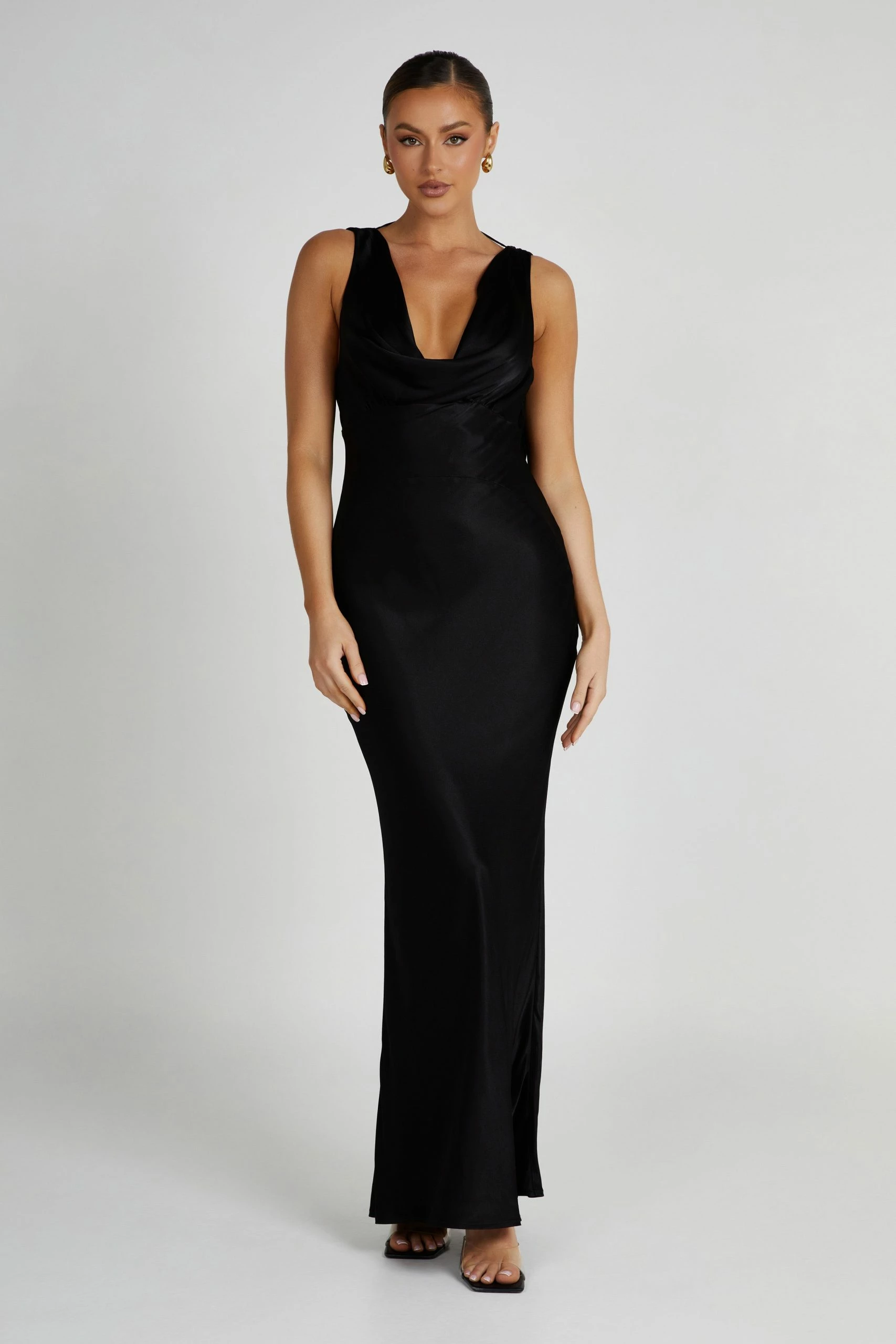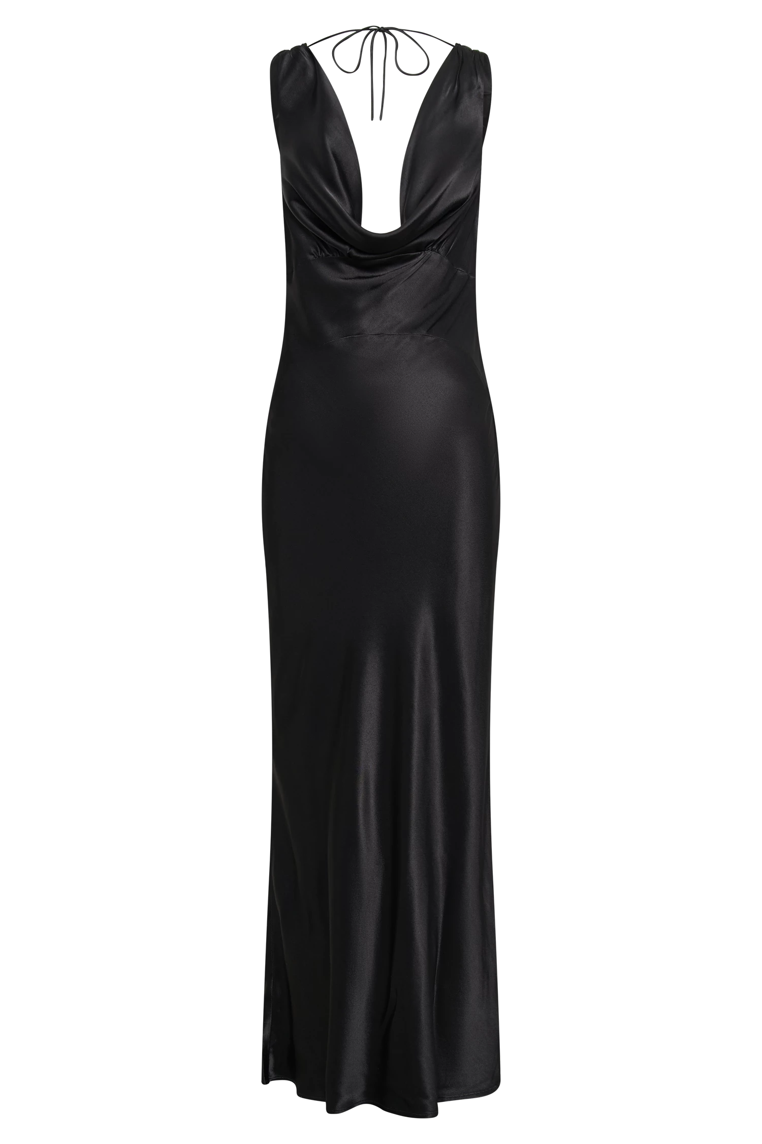 The ANGELIQUE is a satin sleeveless maxi dress with a cowl front neckline and cowl back. Blending both loose and bodycon elements makes for quite the creative and unique silhouette. Unlined viscose and rayon material allows for a relaxed yet flattering fit that still clings and highlights all the right places. A self-tie shoulder strap at the back provides extra coverage and support. The low-hanging hem lengthens the dress into an effortlessly elegant look that’s perfect for formal events.