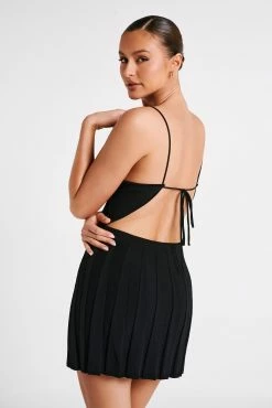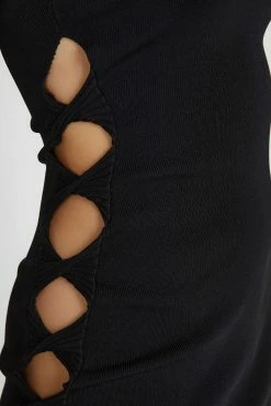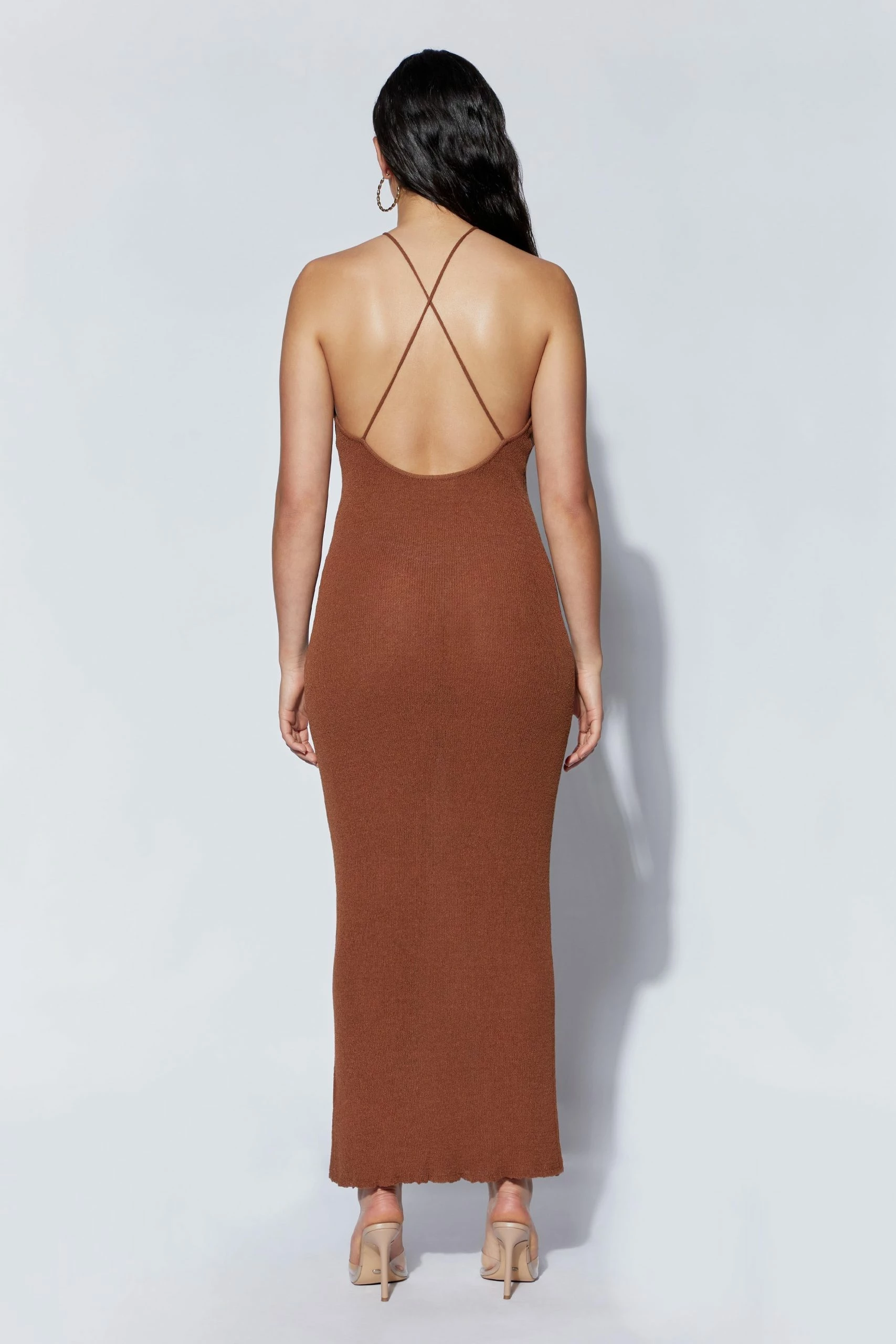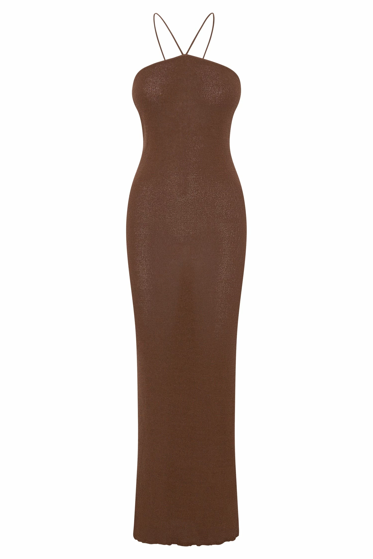 ARYANA may be asymmetrical, but she’s got style completely centred. Her halter-tie neckline paired and slender shoulder straps flatter your neck and décolletage, while her beautiful knit texture adds to the visual appeal. MESHKI’s custom cotton, acrylic, and nylon fabric blend drapes your figure just so, creating soft, overlapping waves around the hem. The low back cut is further accentuated with the crisscrossed shoulder straps. For accessories, pair with an elegant clutch like our Blakely Croc Chain Bag.
