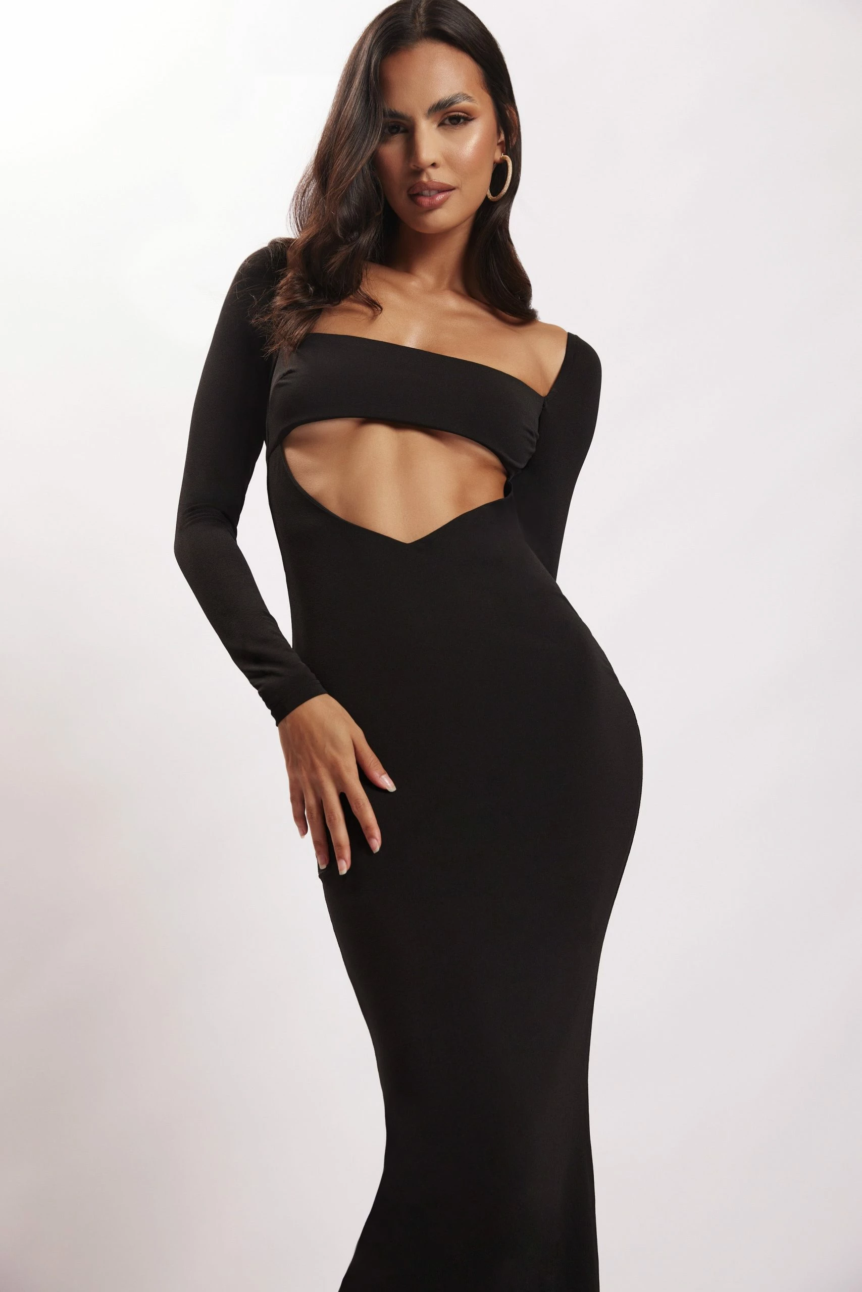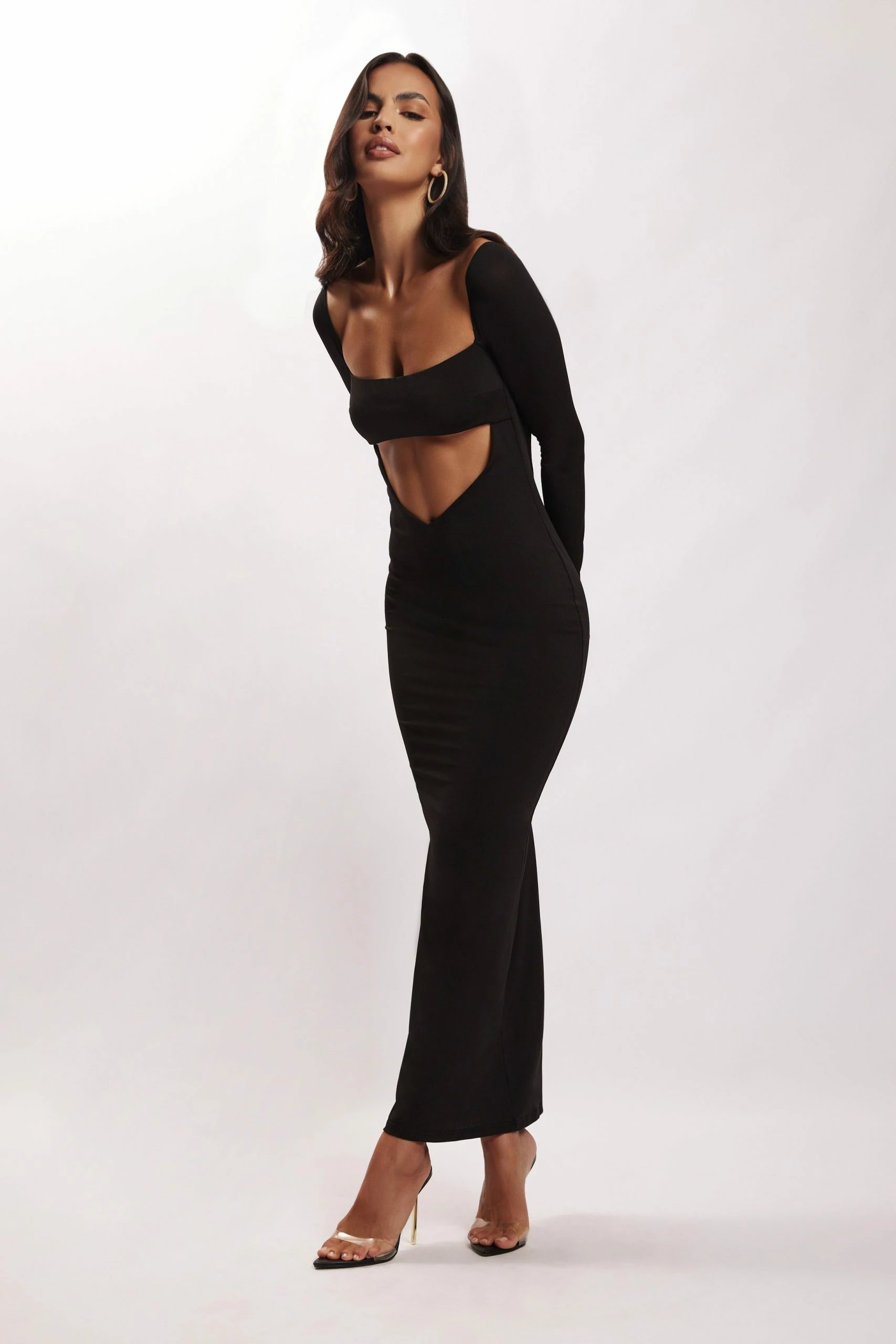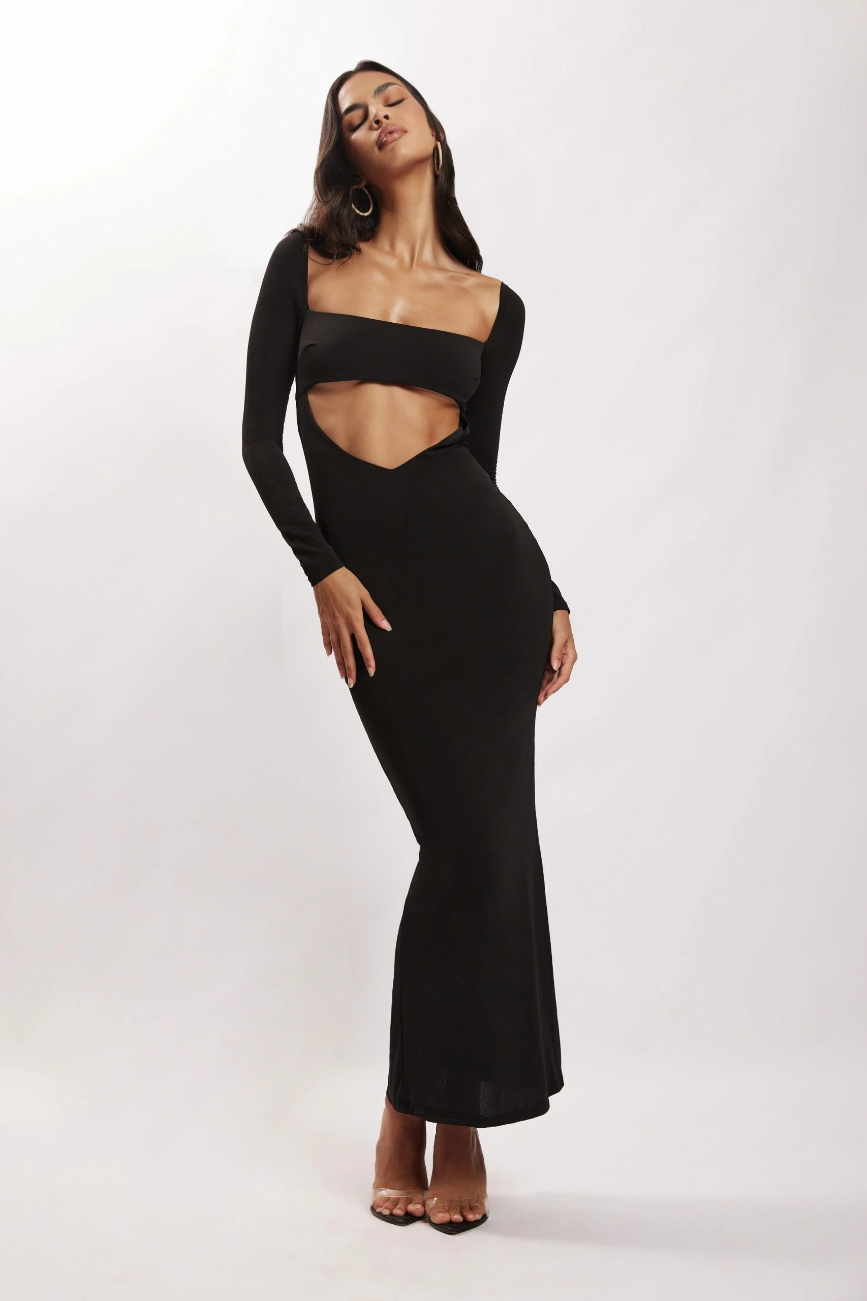 Introducing ASHLEIGH. Mastering the art of reveal and conceal, she is equal parts sleek and sophisticated. Cut from our custom crepe fabrication that works to hug your curves, Ashleigh boasts a squared neckline, mid-waist cut out and a striking open V back. Elevate this masterpiece with gold jewellery and barely-there stilettos for all eyes on you. Â