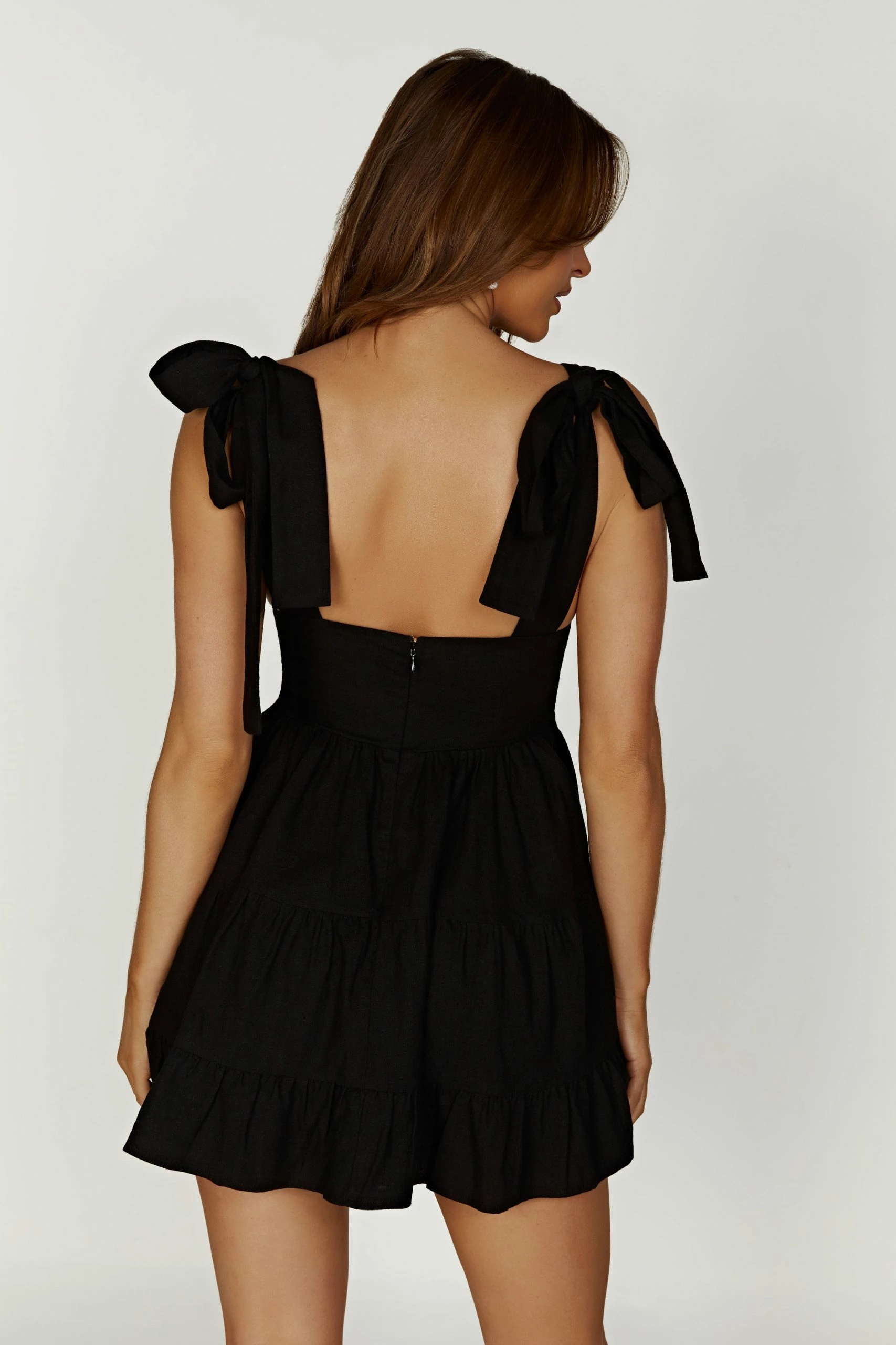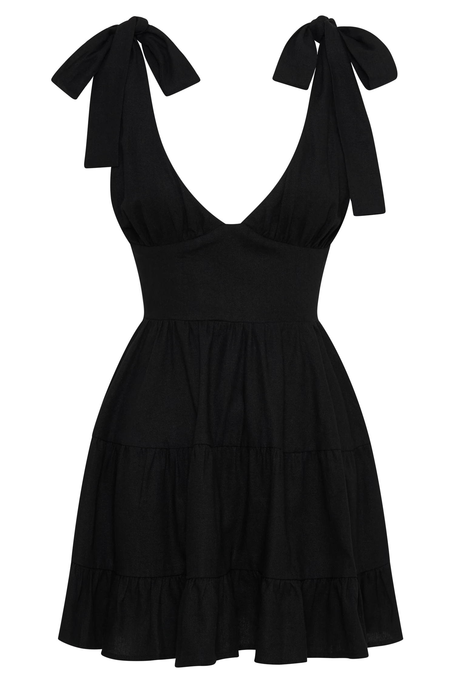 AURELIA is a sleeveless linen midi dress with a deep, wide neckline, tiered ruffle skirt, and wide shoulder straps with loose fabric bow details. The bodice has a smoothing, cinching effect around the lower torso and the skirt is a wide, a-line cut that falls to a little above the knees, creating a classic sophisticated silhouette. Slight ruching around the bust and a low, open back for effect. Finish the look with chic sandals.