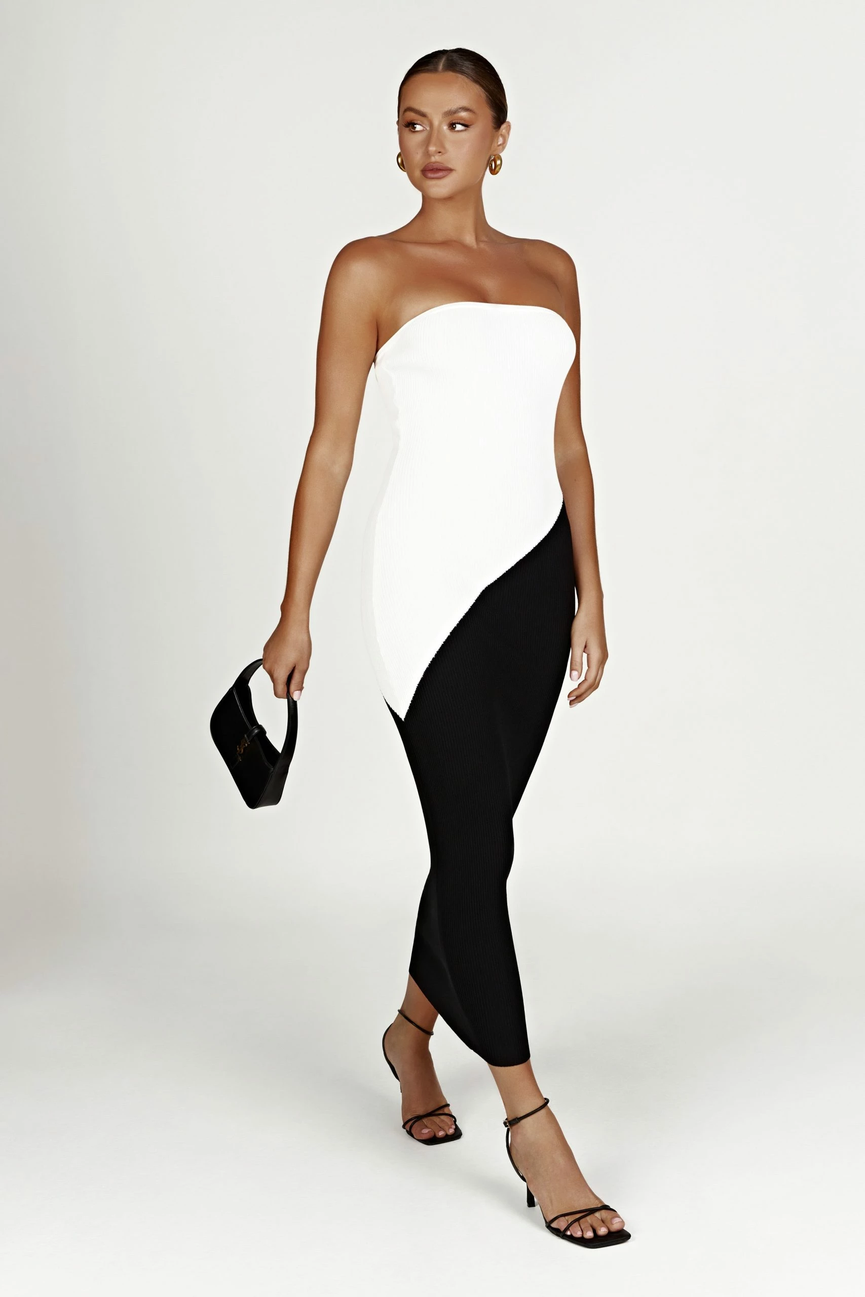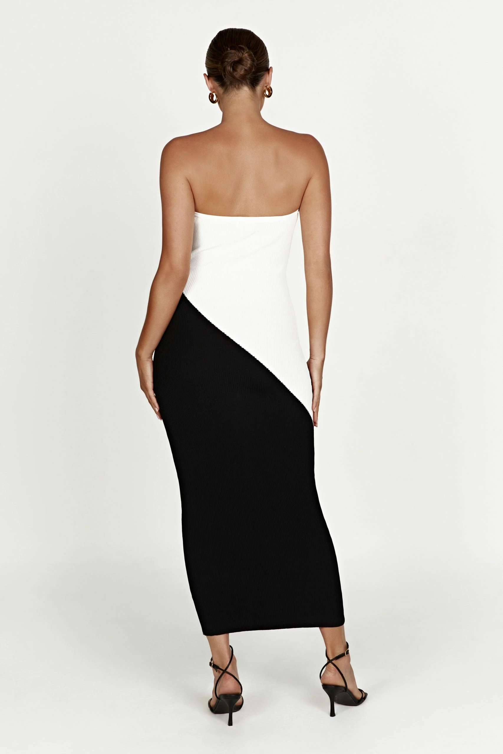 A beautiful, asymmetric strapless maxi made from a curve-hugging knit fabrication, BRISTOL knows how to make a girl stand out. The contrasting colours enhance the sharp slants and lines of the dress, creating a streamlined look while the elasticated neckline also ensures Bristol doesn’t slip off. Style with our accessories for your next event.
