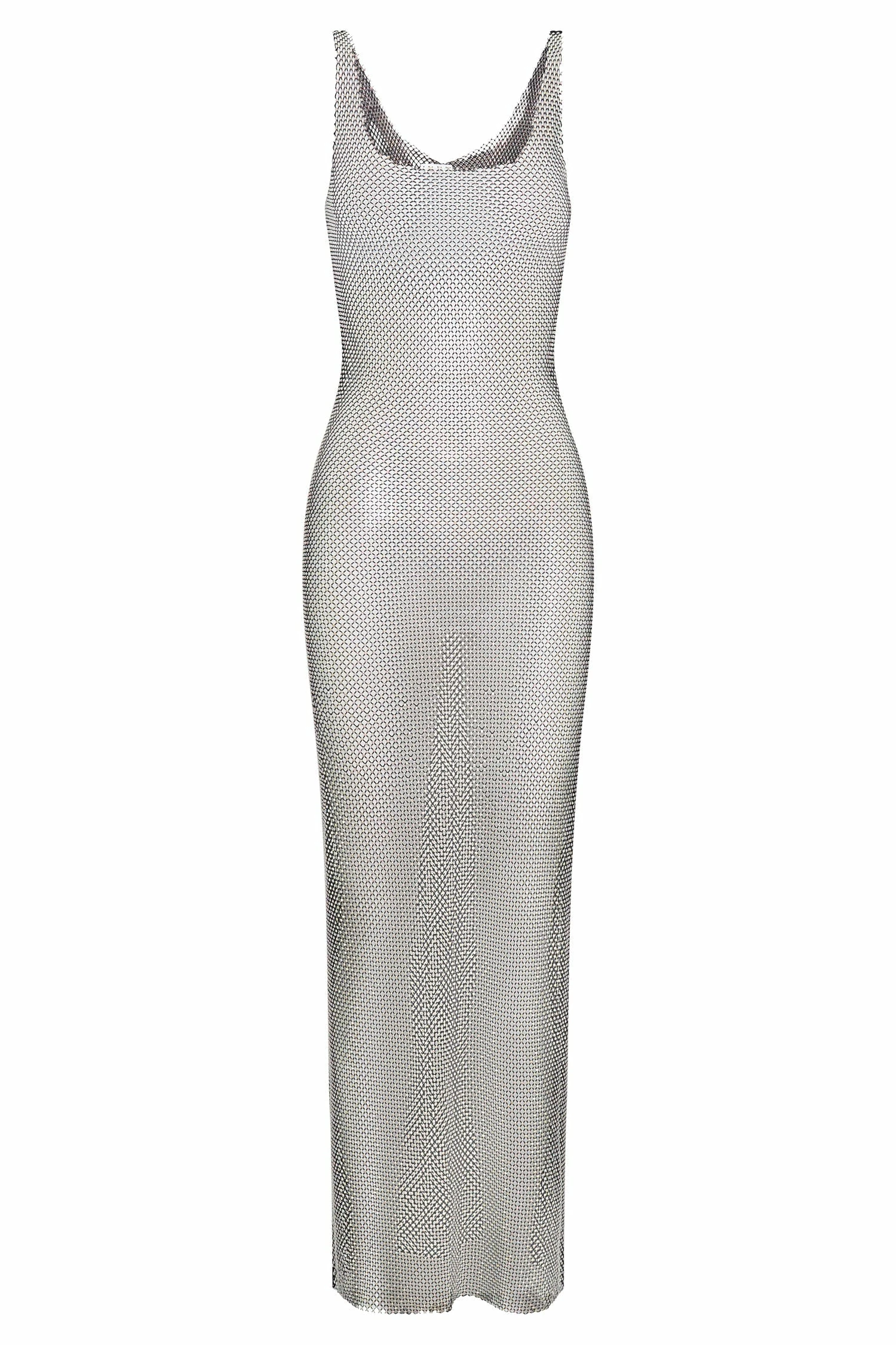 DELARA brings the romance of a night-time seascape, wherever you are. She’ll help you light up the room as soon as you enter, with rhinestones, soft mesh, and a unique cut. Beneath the sheet of glittering fabric, she’s simple — but suggestive. The bandeau and undie combination leave very little to the imagination, but the rich, translucent material covering balances it out with a layer of allure. Soft nylon and elastic lining keeps the bodice moulding to your shape while the loose, polyester skirt drapes your hips and falls to your ankles, creating a fetching contrast. Finish your look with loose beach waves and our Brandy Ankle Strap Heels.