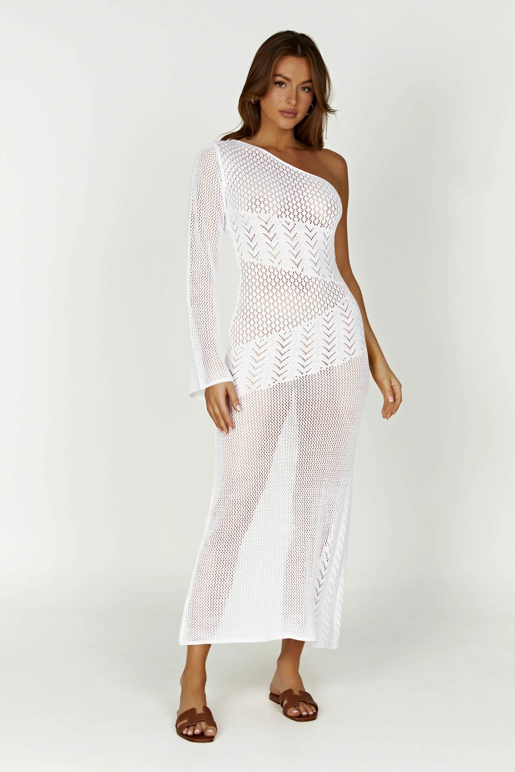 JODY is a fitted, single-sleeved maxi dress with a low, open back, a functional tie at the back (to close), and an asymmetrical theme. The right arm and shoulder are swathed in 100% unlined acrylic while the left arm and shoulder are completely exposed. The dress also uses spliced asymmetrical knit panels in contrasting texture designs to further the eye-catching theme. Pair with our Kailani Platform Heels to complete the look.