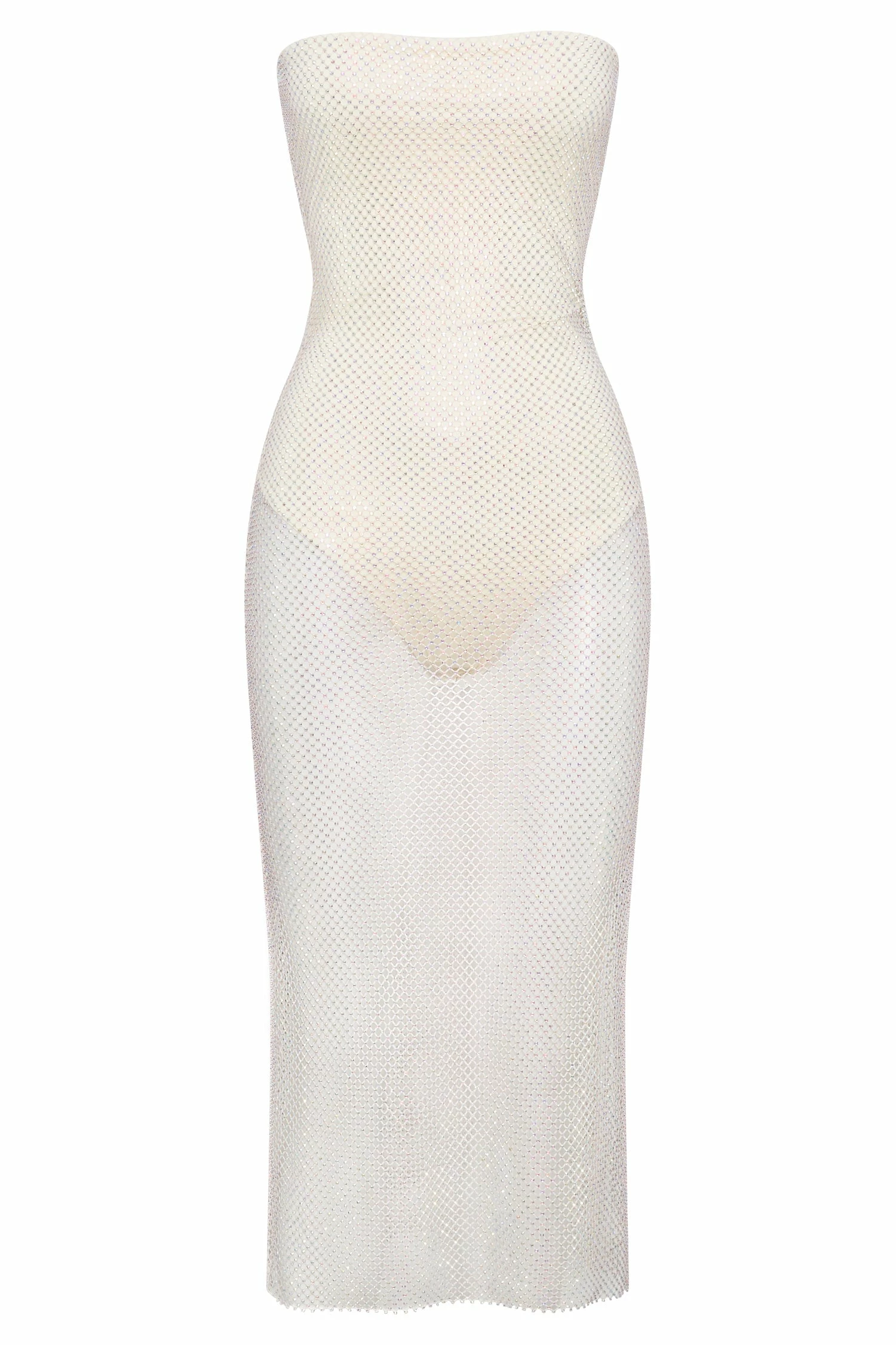Gorgeous and daring, NIMA holds no punches. She is art, she is luxury, and she knows how to make a statement. Covered in high-quality rhinestones and draped in beautiful elastic mesh, she’s a midi dress unlike any other. The bodice is a strapless bodysuit cut high up the hips and clean across the chest. The skirt is a sheer, sleek material that teases your shapely legs. Complement Nima’s unique design with a pair of satin platform heels like our Mikaela Satin Platform Heels.