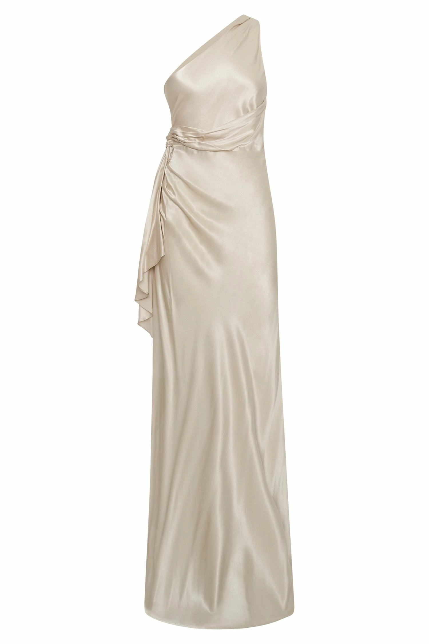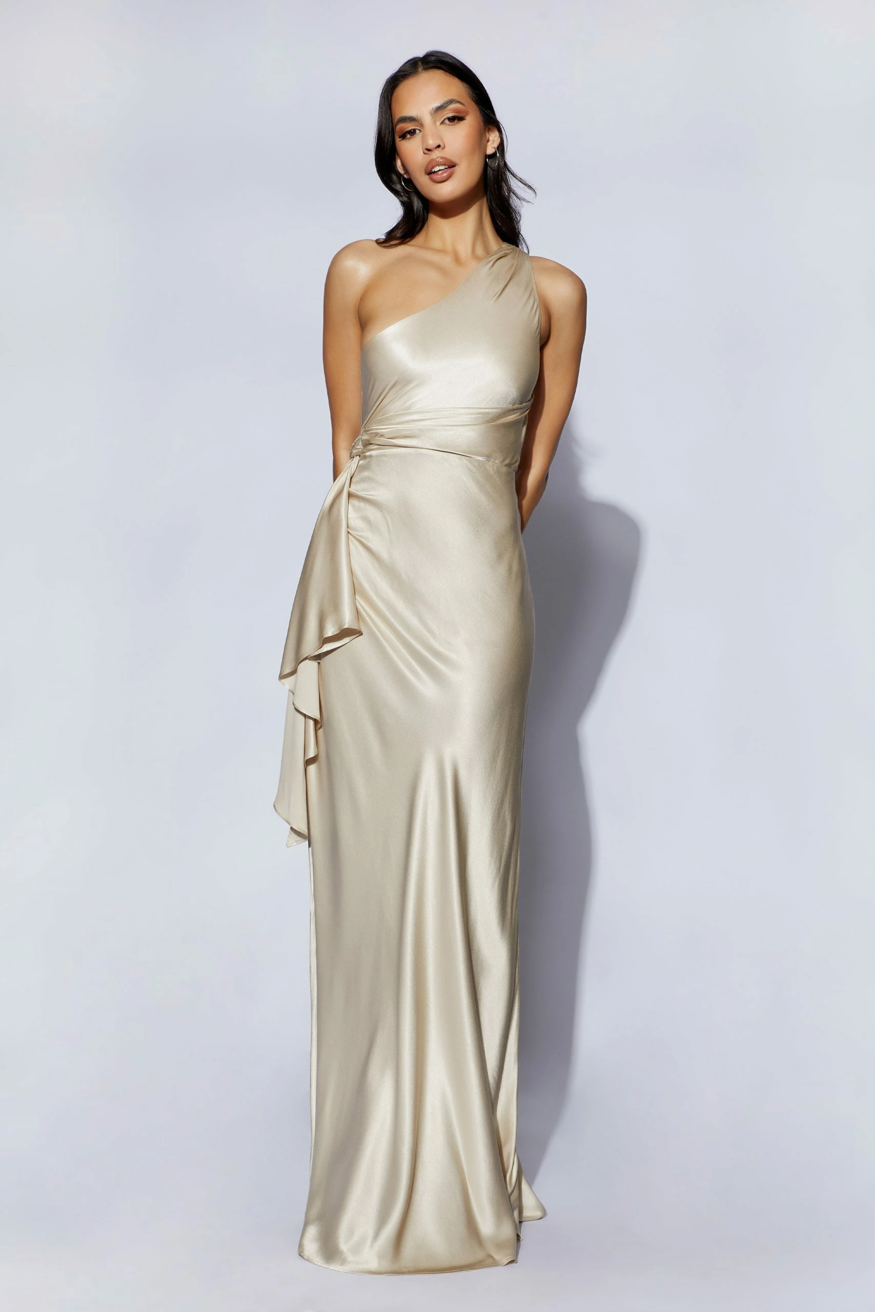 Look as otherworldly and as inspiring as the muses themselves; CALLIOPE is raw, unfiltered grace and beauty. The soft folds and bunches of fabric only serve to enhance how stunning she is in her simplicity. The slanted, single-shoulder neckline, the side-waist waterfall panel, and the draped hem all flatter Calliope’s simple maxi cut. The artistry in the little details is a visual treat. Fluid and poetic, like the muse after whom she’s named, Calliope is sure to make you feel elegant and gorgeous; a cut above the rest! Complete your look with a pair of small, sensible heels — like our Brandy Ankle Strap Heels.