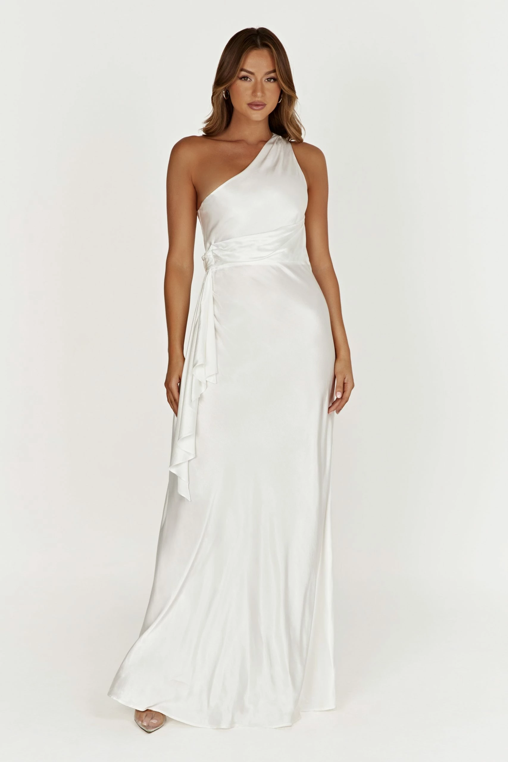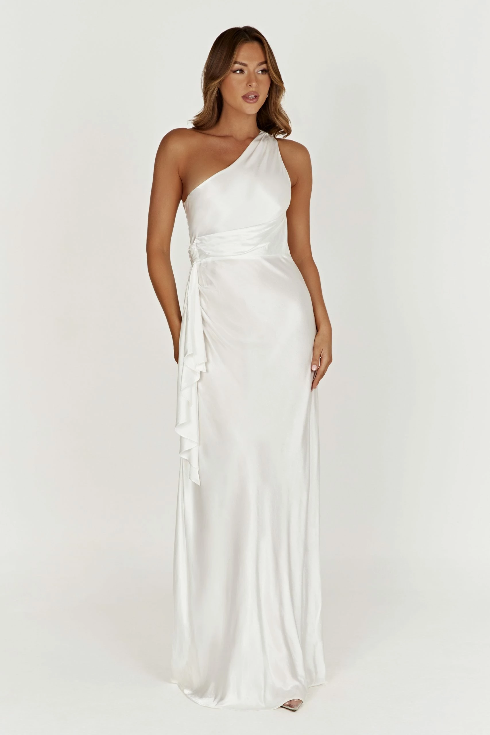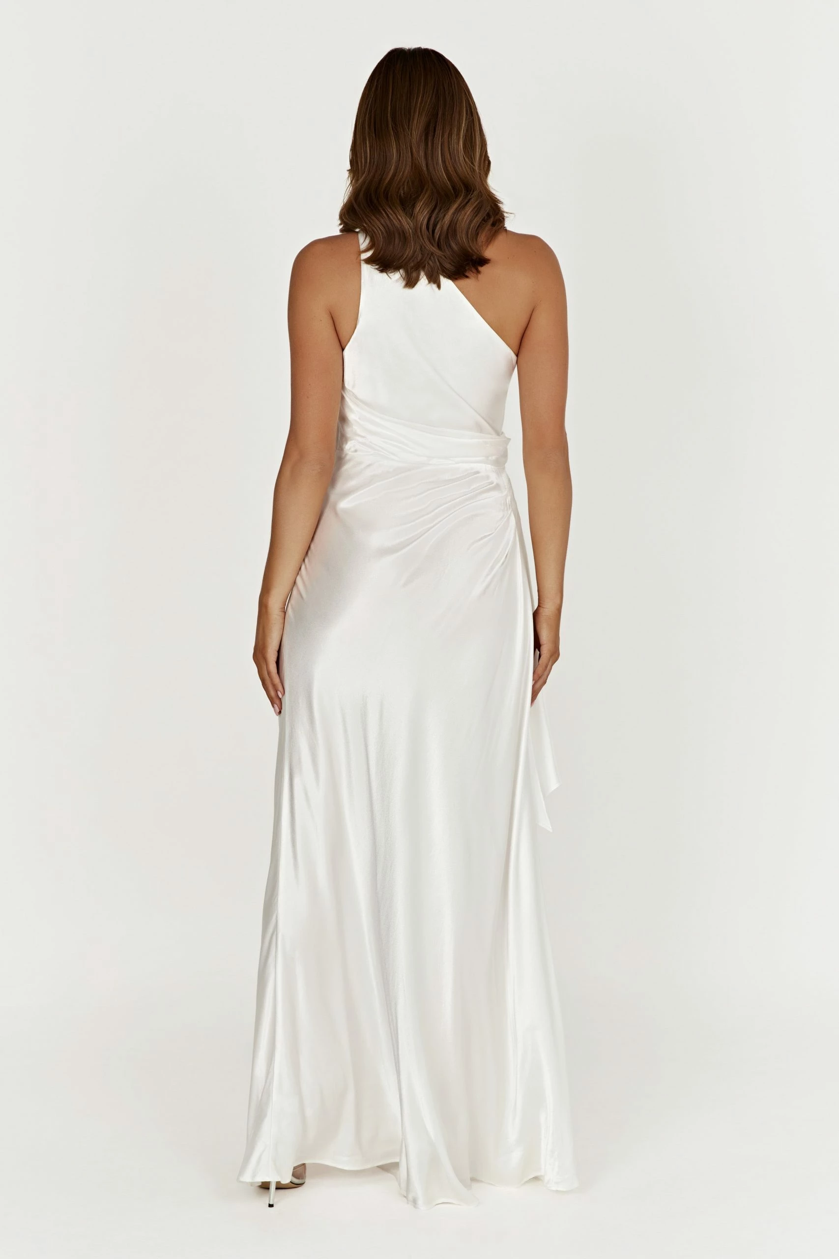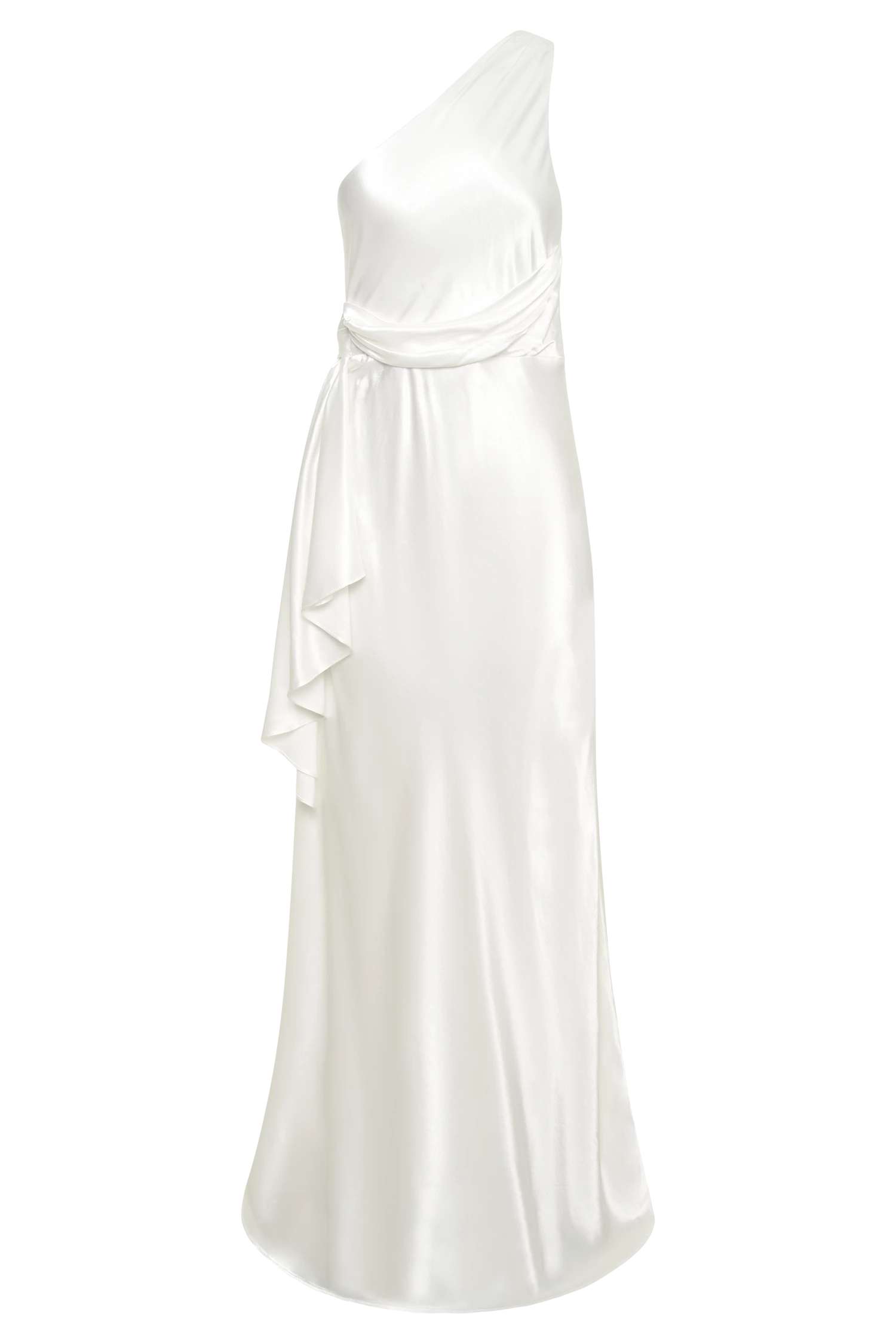The CALLIOPE One Shoulder Maxi Dress creates the perfect feminine silhouette for bridesmaids or brides looking to shy from tradition. Featuring a one shoulder look and crafted with a waterfall panel draped at waist, it also boasts a hook-and-eye closure at the top of the zipper of the dress to fit your form. Style with minimal accessories for a look to remember.