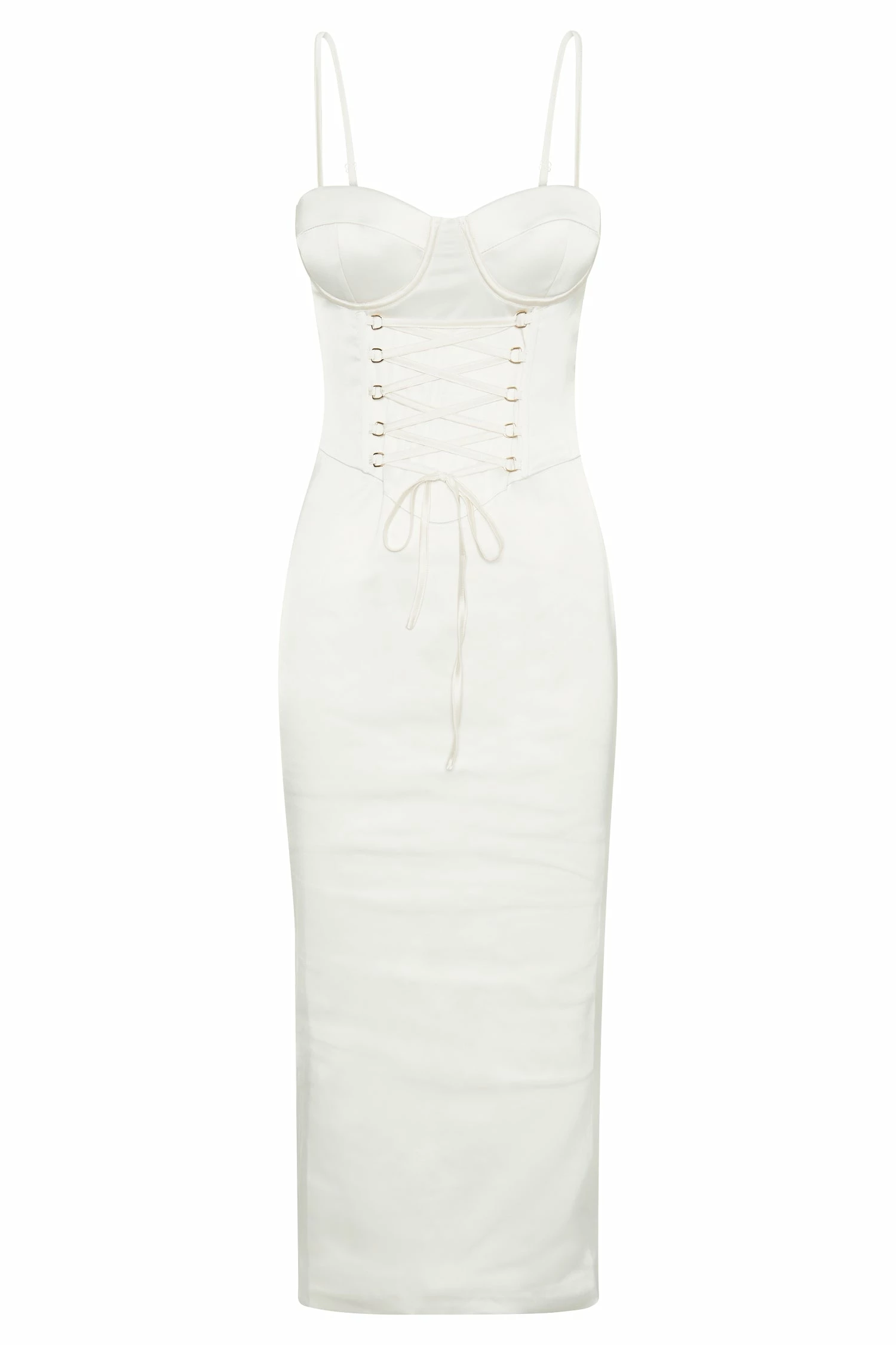 This structured corset midi dress is made from our soft and luxurious satin fabric that embraces every curve. It features a smooth lining and sweetheart bustier neckline for support, with adjustable straps, a drawstring waistline and centre-back split for easy wear. Romantic and cinematic, pair with your favourite heels for an iconic look.