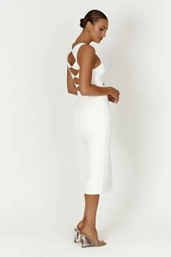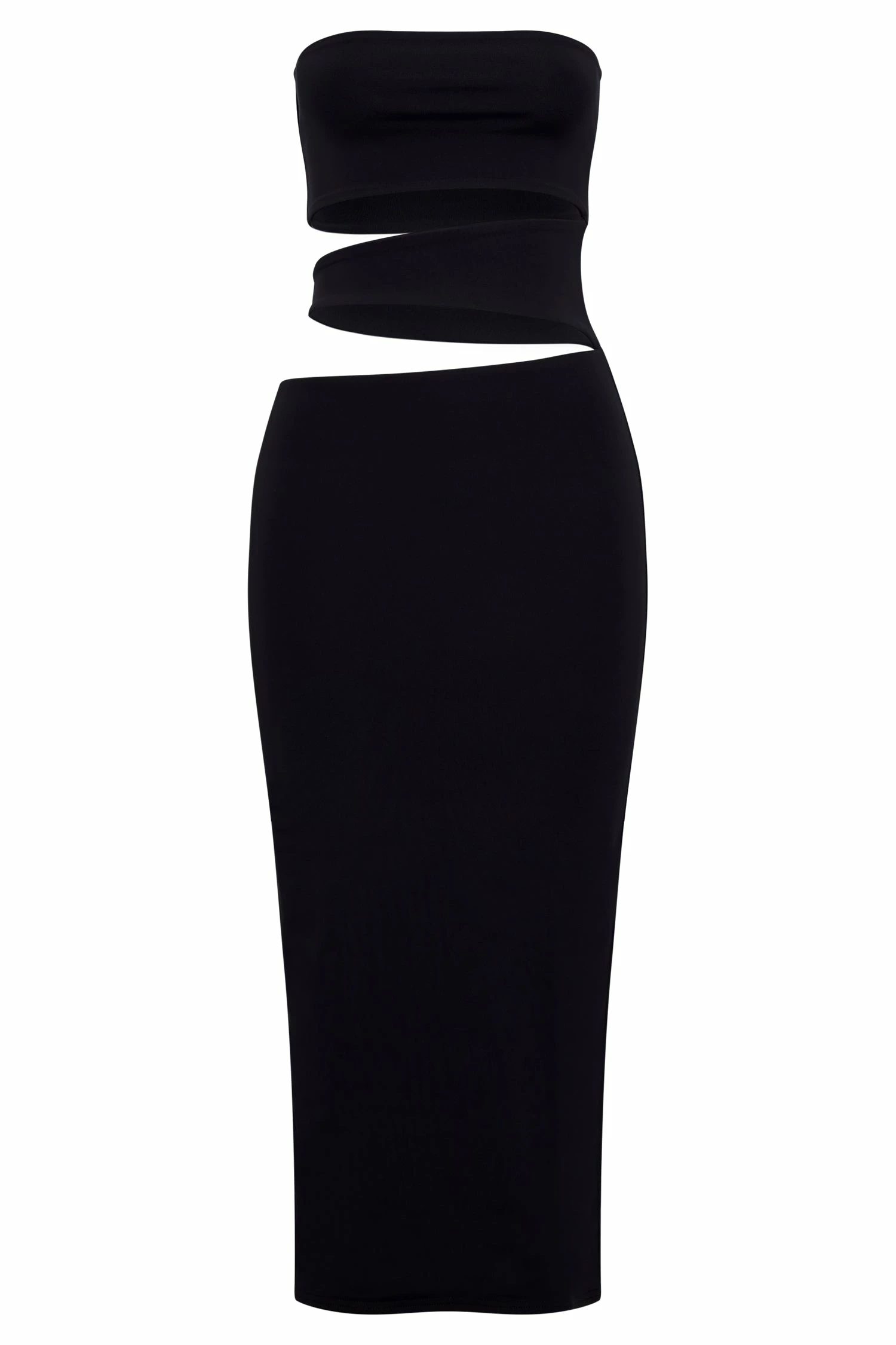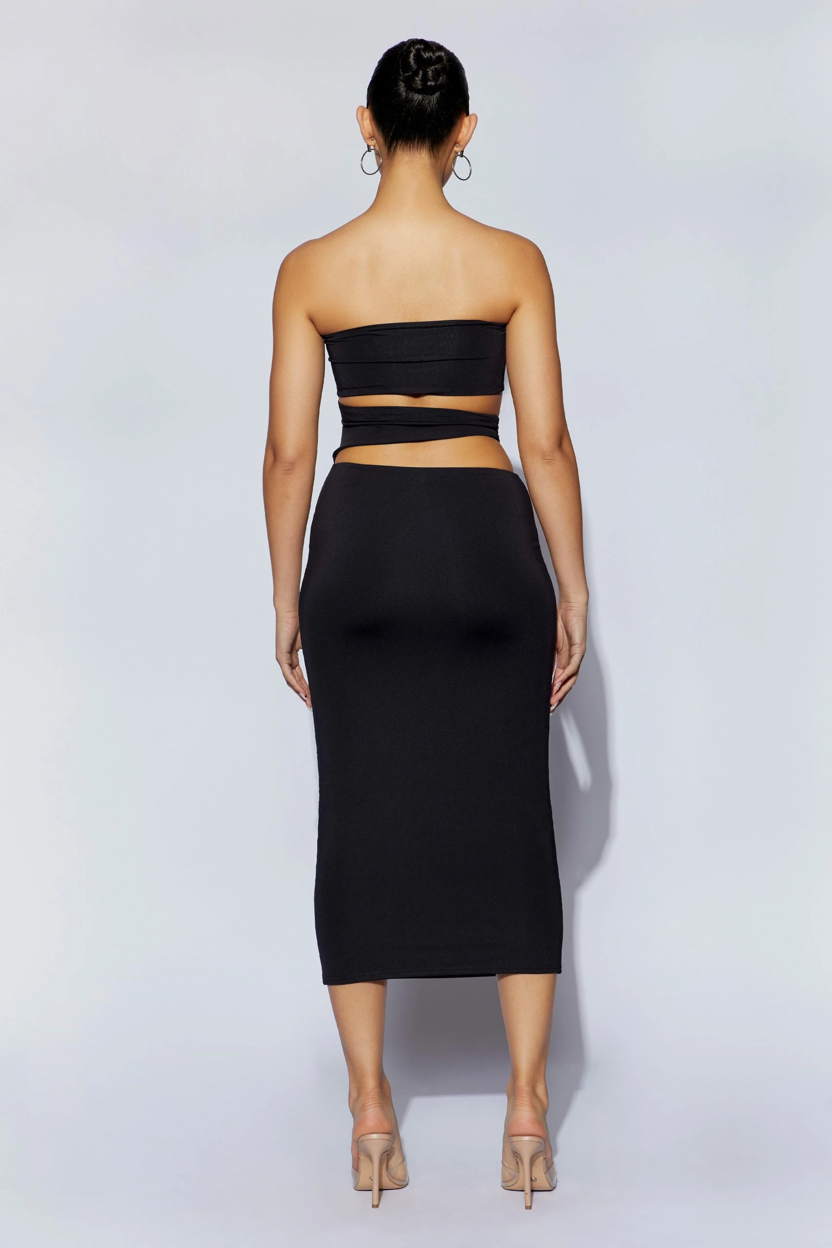 CASSANDRA challenges assumptions, chases opportunities, and breaks the mould. And she does it with such poise, she leaves heads spinning. Perfectly poised and wholly unapologetic, she’s made for your feisty side. If you know how to wield grace and elegance to your advantage, Cassandra is your soul sister. Asymmetrical cut-outs around the waist emphasise your curves and dips. A tube-cut bandeau bodice balances out bare, slender shoulders. And the long pencil skirt tastefully hugs your curves. For a balanced look, soften Cassandra’s visuals with a delicate pair of heels, like our Caitlin Diamante Rope Heels.
