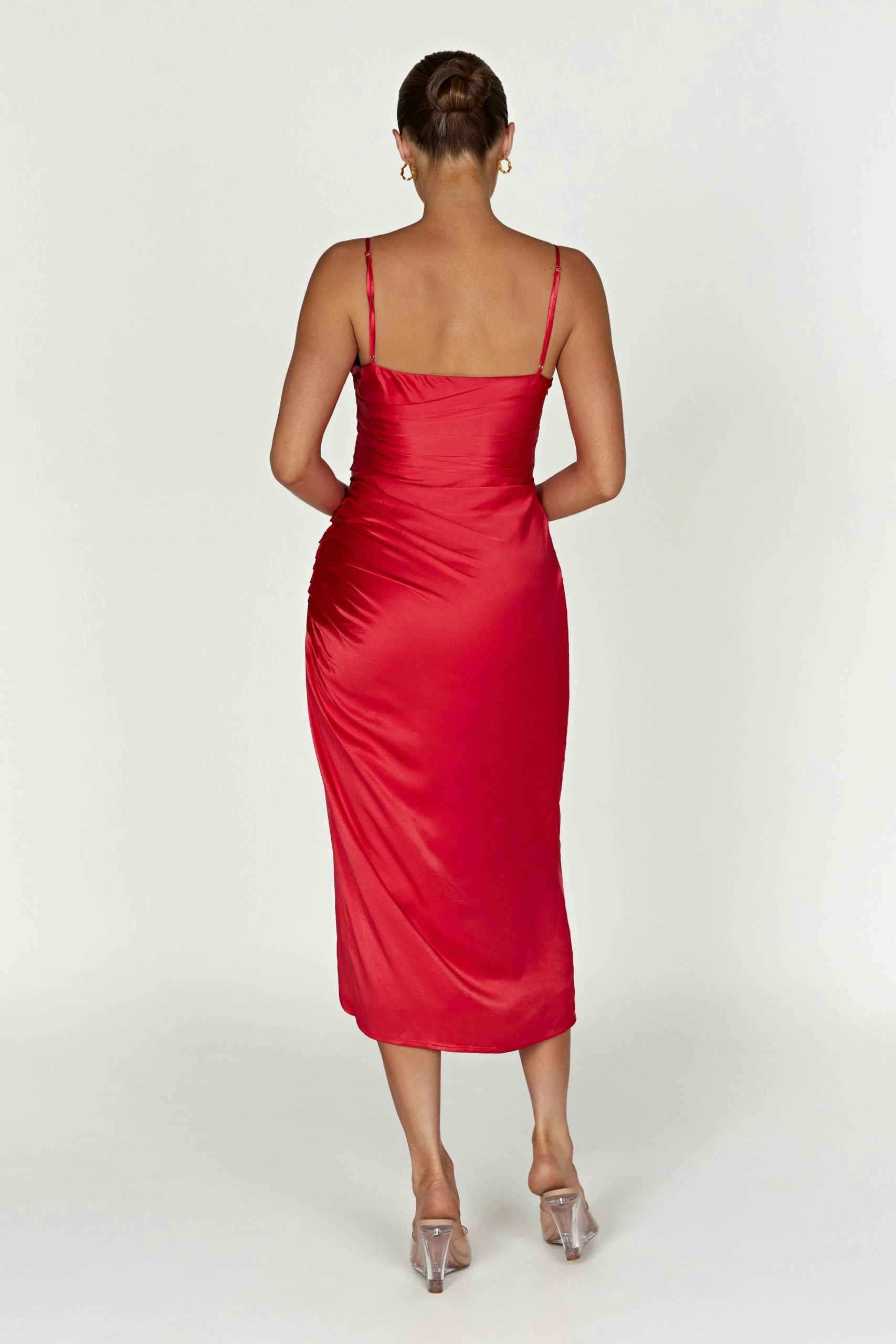 Fit and flattering, this satin drape midi dress is cut to emphasise curves. Thin, adjustable shoulder straps hold up a straight-cut neckline and low back. A thigh-high slit on the left side is cut to teasingly accentuate the leg. The asymmetric silhouette perfectly complements the dress’s ruched, draped effect as well. Fun and flirty, Claudette will look effortlessly elegant with dainty heels and minimal jewellery.
