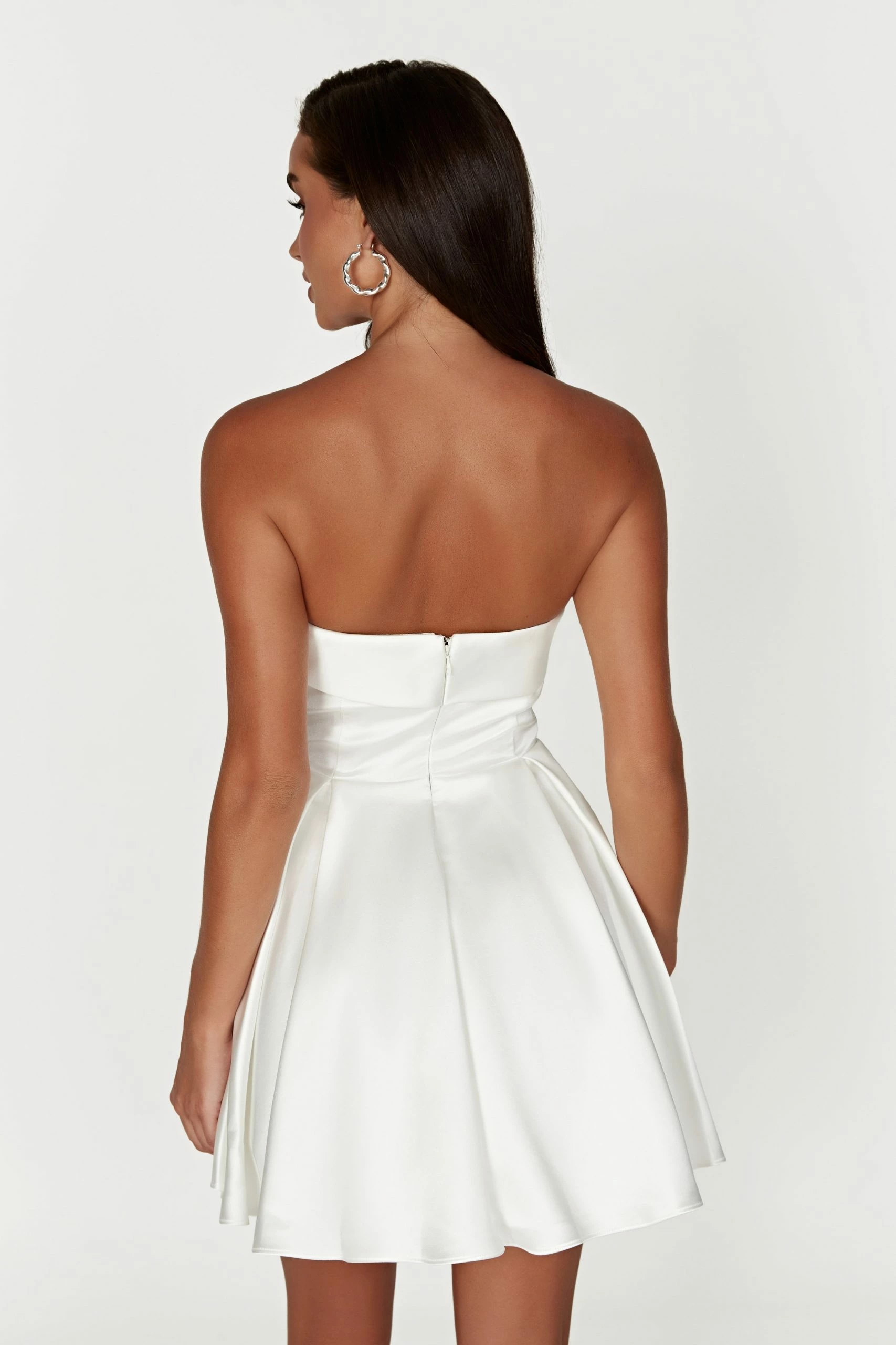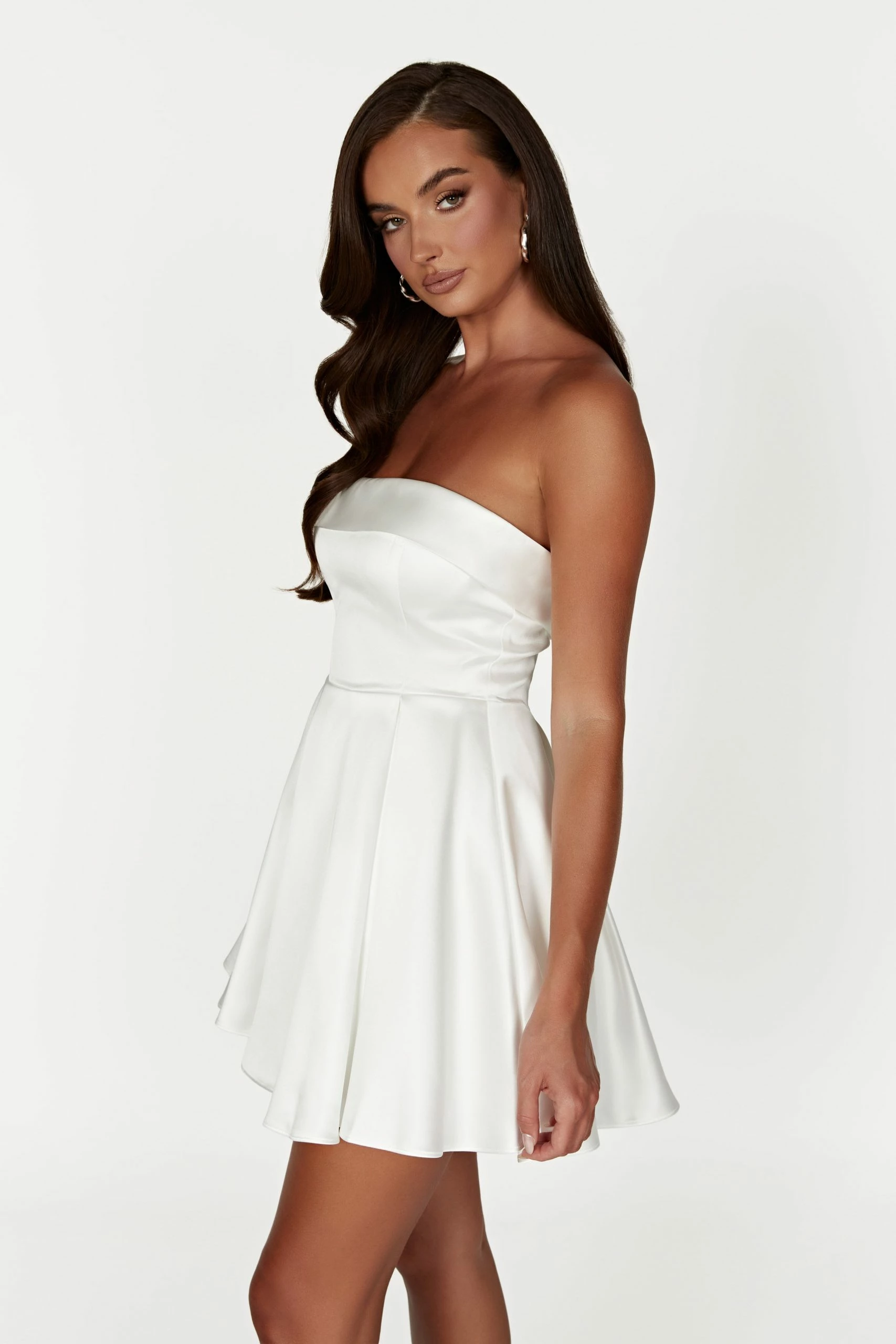 The EILEEN is a structured Mini Dress that features a boned and detailed bodice that is intricately crafted to give the illusion of a corset. Its box pleat skirt gives off an elegant drape while its layered tulle creates volume and fullness. Wear down the aisle with our Margareta Veil, or as a second-dress for making moves on the dance floor.