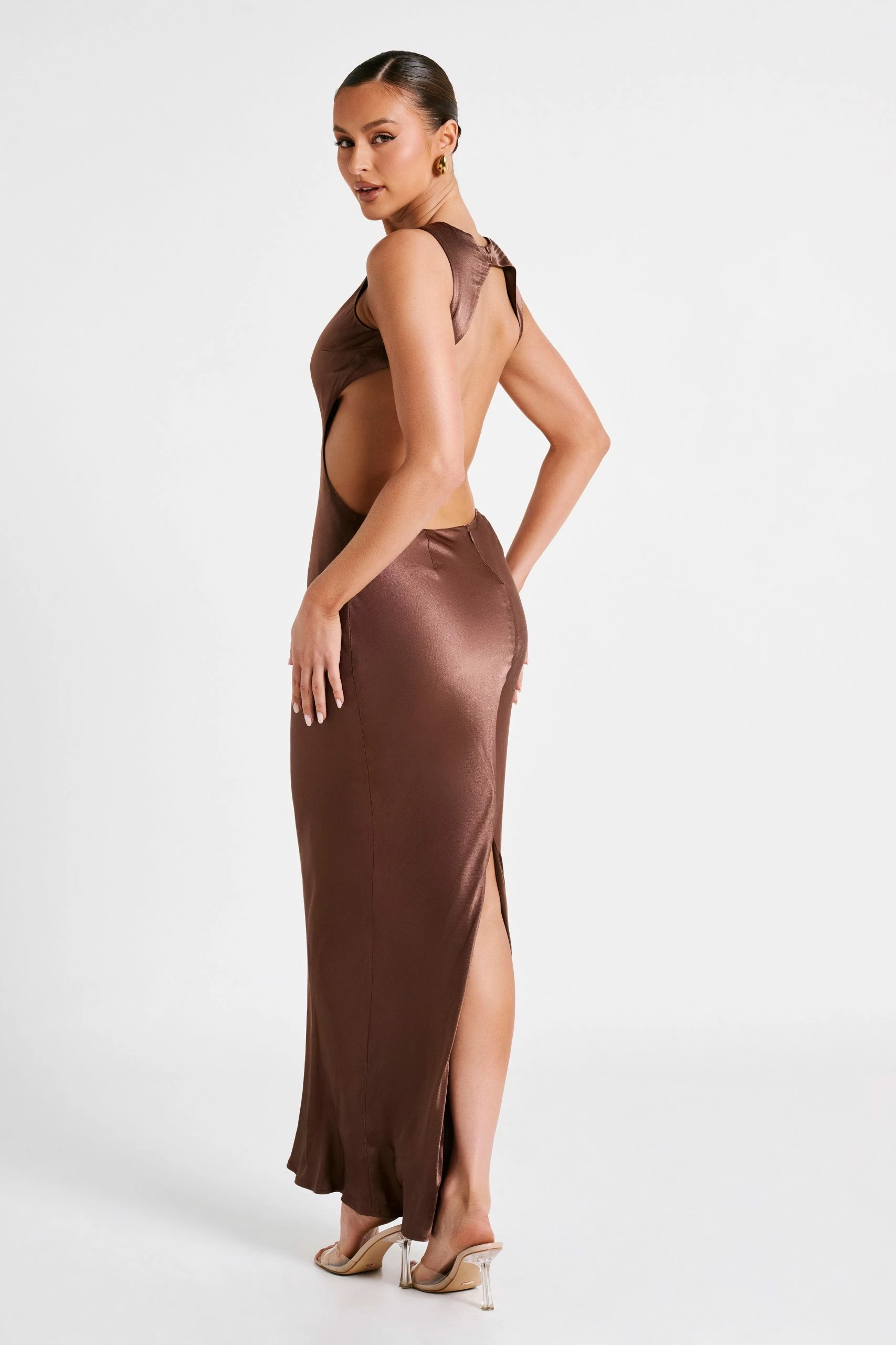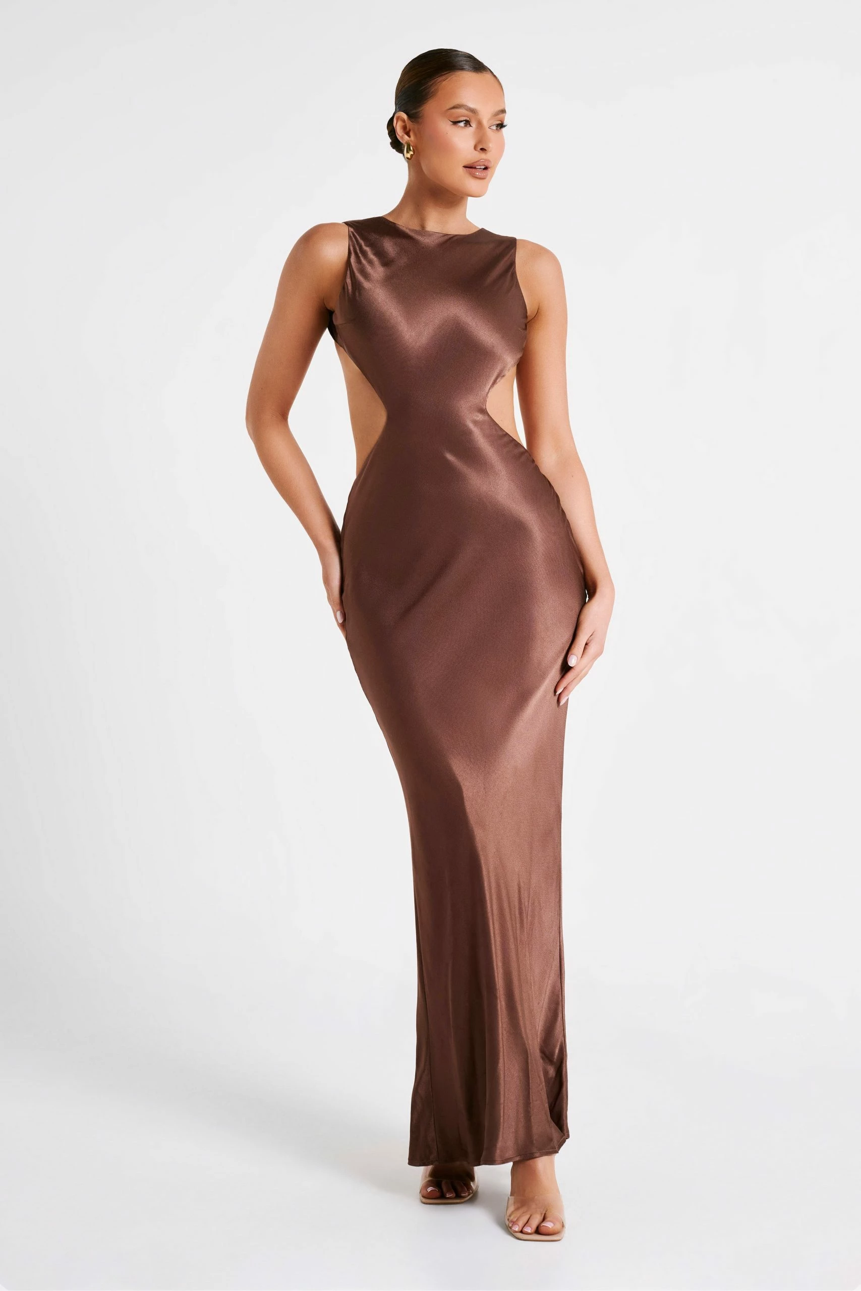 ELECTRA is a bold, sleeveless maxi dress with strategic side waist cut-outs and a wide, open back. Made from a soft, satin fabric blend, this dress ebbs and flows along the body like water. The high neckline and solid front contrasts beautifully with the low, open back. A knee-high centre split at the back allows for more movement and mobility without compromising the dress’s overall clean silhouette. Modest and modern, this dress will look fantastic with the Fleur Thin Strap High Heels.