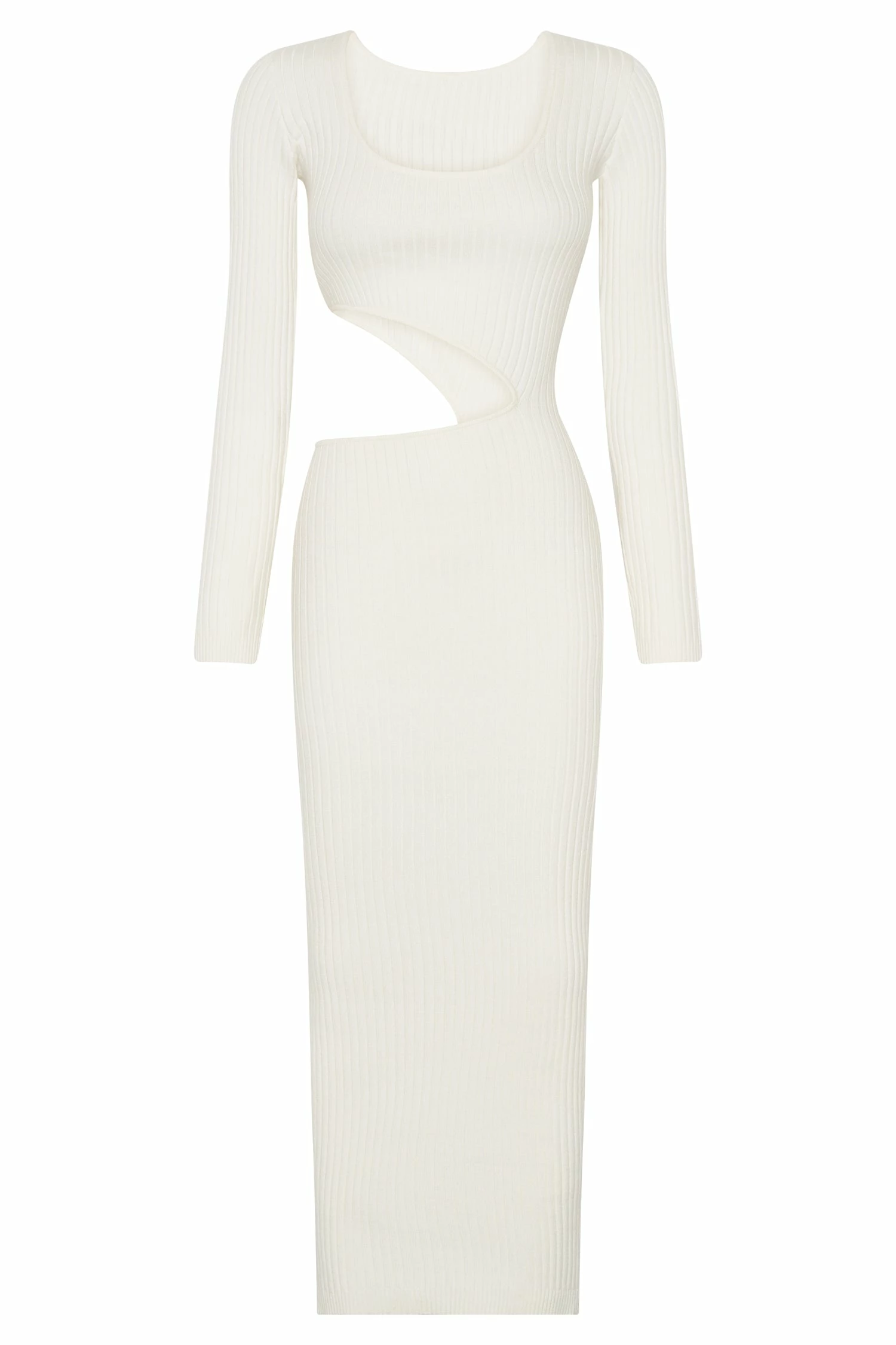 The GAIA Cut Out Asymmetric Knitted Midi Dress takes a modern twist on your classic midi. She is cut from a soft ribbed knit fabrication and boasts a scoop neckline to highlight your décolletage and a statement side cut out that has been intentionally placed to flatter your figure. Complete your look with a sleek bun, your favourite heels and a bold lip for your next dinner date.