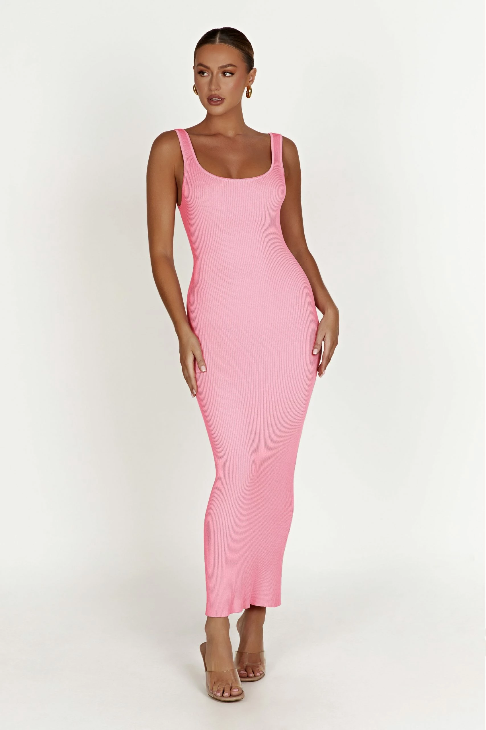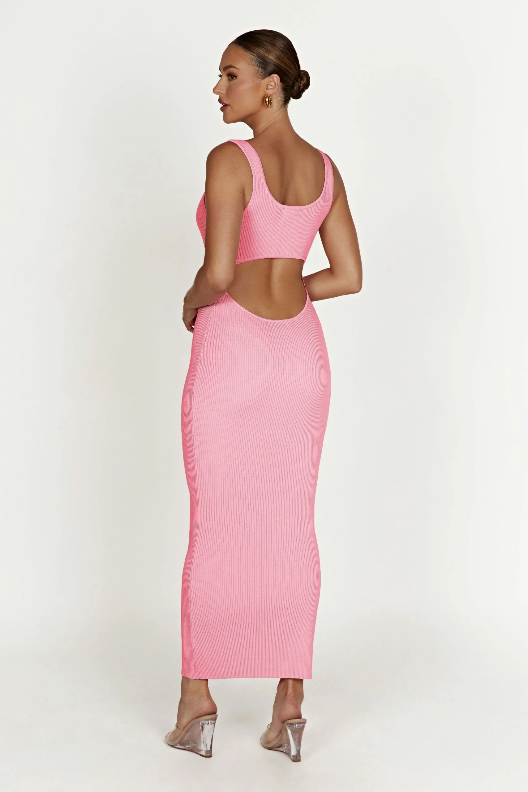 HADLEY is a Knit Maxi Dress with a flattering scooped neckline, wide shoulder straps, and a shape-emphasising cut-out in the lower back. From the front, it looks like a classic, stylish maxi dress. From the back, it looks like a cool cropped top and a curve-hugging fit. Pair with barely-there heels to complete the look.