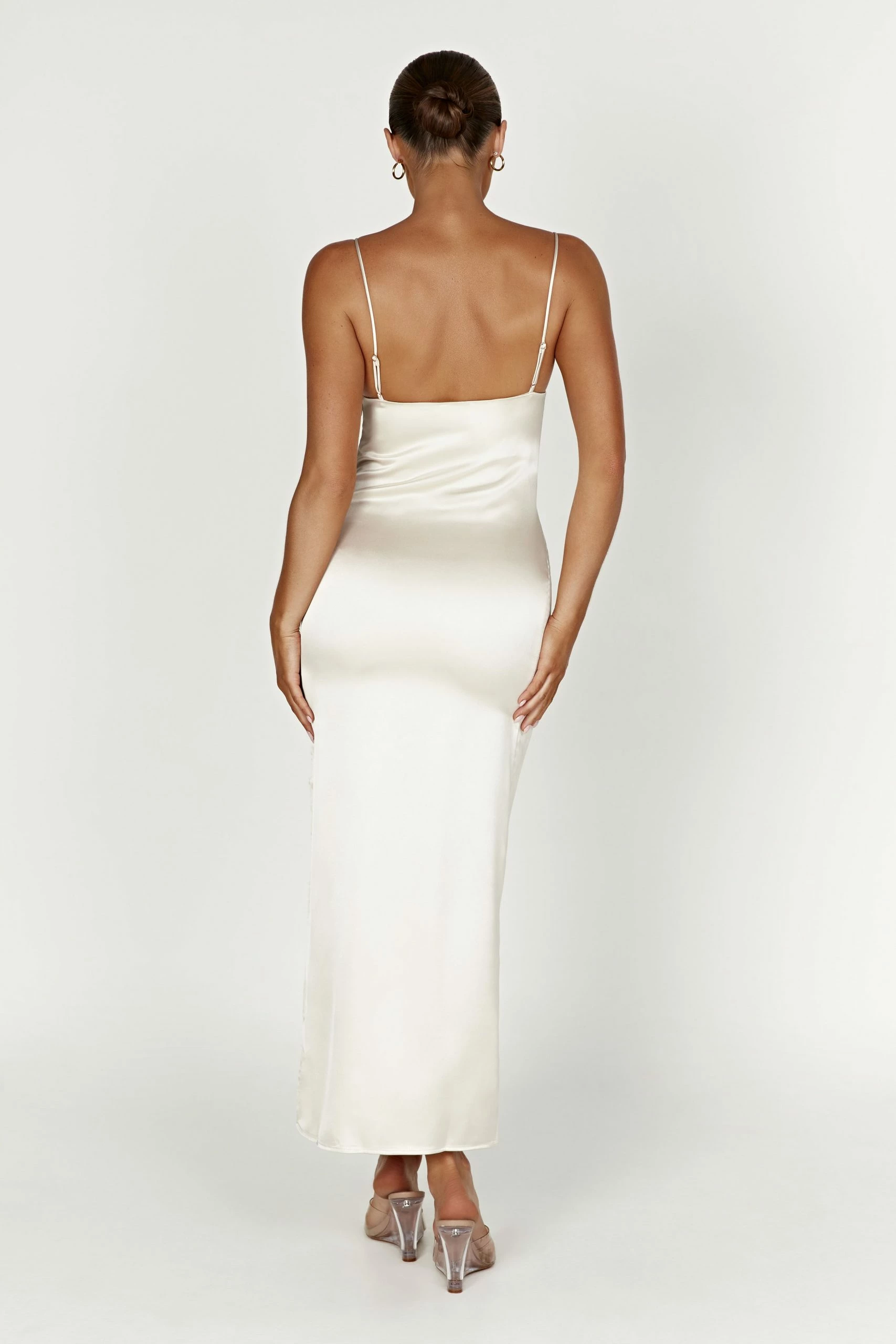 JACINDA is a sleek Satin Slip Maxi Dress, designed with delicate spaghetti straps and a front slit for easy movement. With a low-cut back design, it’s the perfect choice for looking effortlessly chic, all year round! Layer it under our Irina Chunky Knit Cardigan or pair with our Brandy Ankle Strap Heels for your next dinner date.