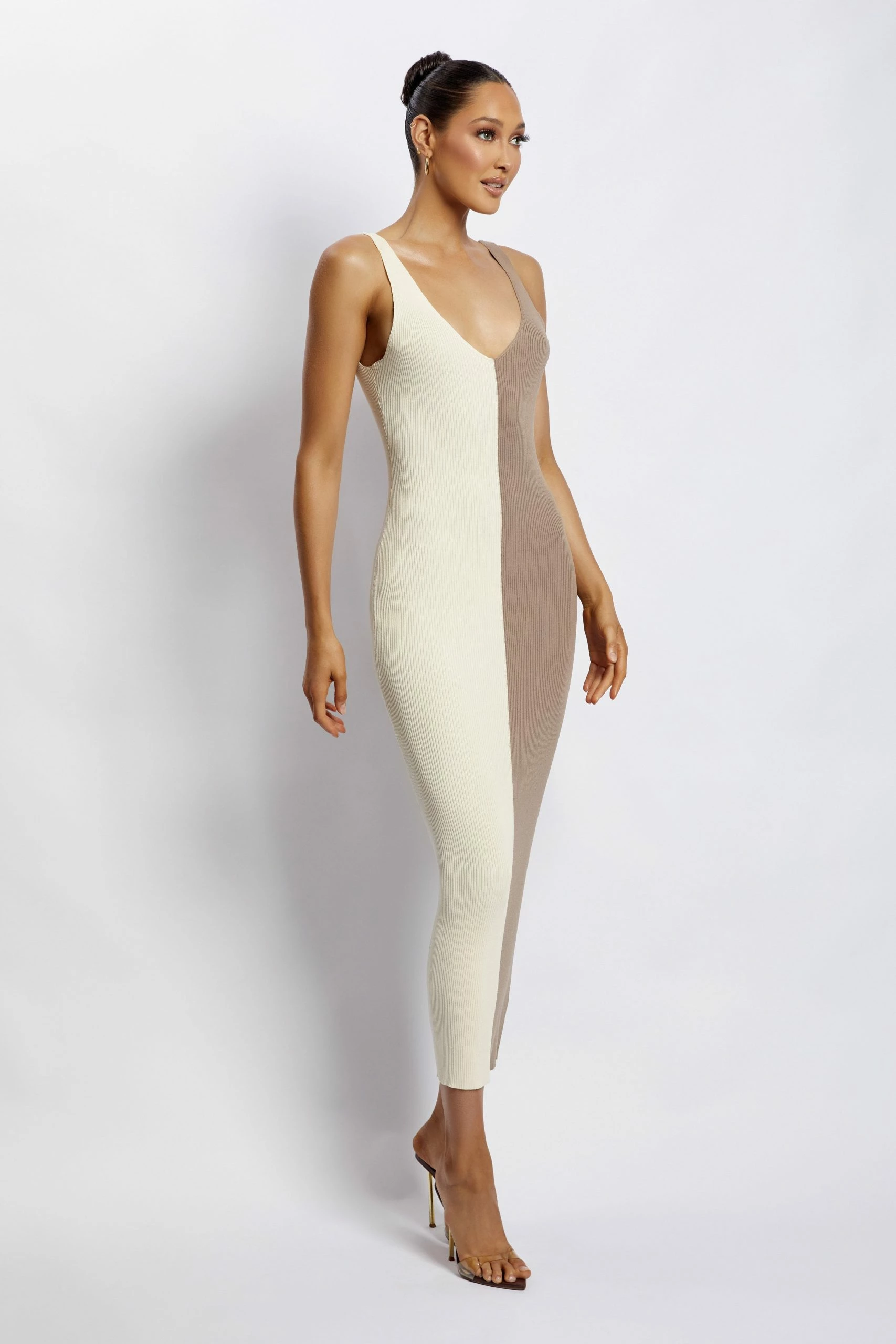 Equal parts effortless and sophisticated, the JODIE Two Tone V Neck Midi Dress has been designed to leave memorable impressions. Showcasing a form-fitting silhouette, Jodie is cut from a ribbed knit fabrication in a dual tone design and features a plunge V front and back neckline. She’s perfect for intimate dinner dates or sundown cocktails with the girls.