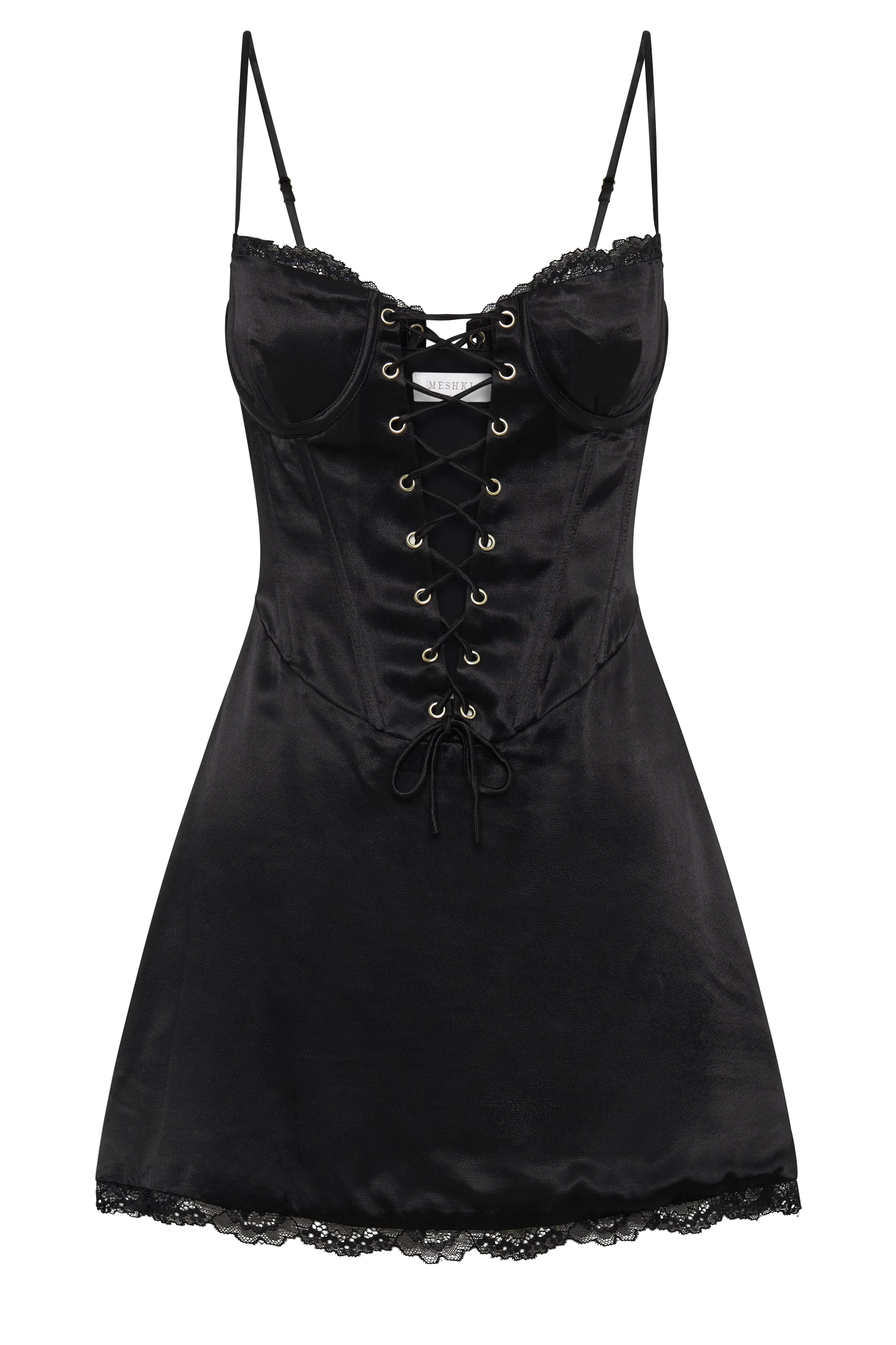 This is a semi-structured slip mini dress, with centre-front ties, lace trim detailing, and underwire construction with internal boning for support. Featuring a hint of lace to soften the look, KALILA is lightweight and soft, but serves a serious look. Complete the look with our Milly Faux Leather Wrap Around Heels.