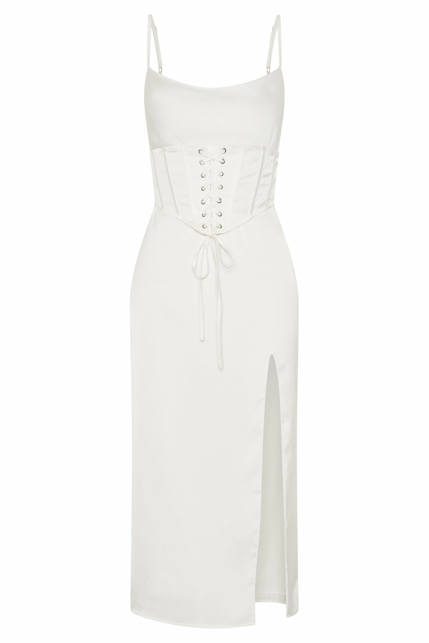 LUCY marries regency-era form-fitting corsetry against a modern cowl neckline. Crafted from a relaxed satin fabric and secured using a centre zip to the back, Lucy makes dressing for your next event a cinch. Wear with our Brandy Ankle Strap Heels to complete the look.
