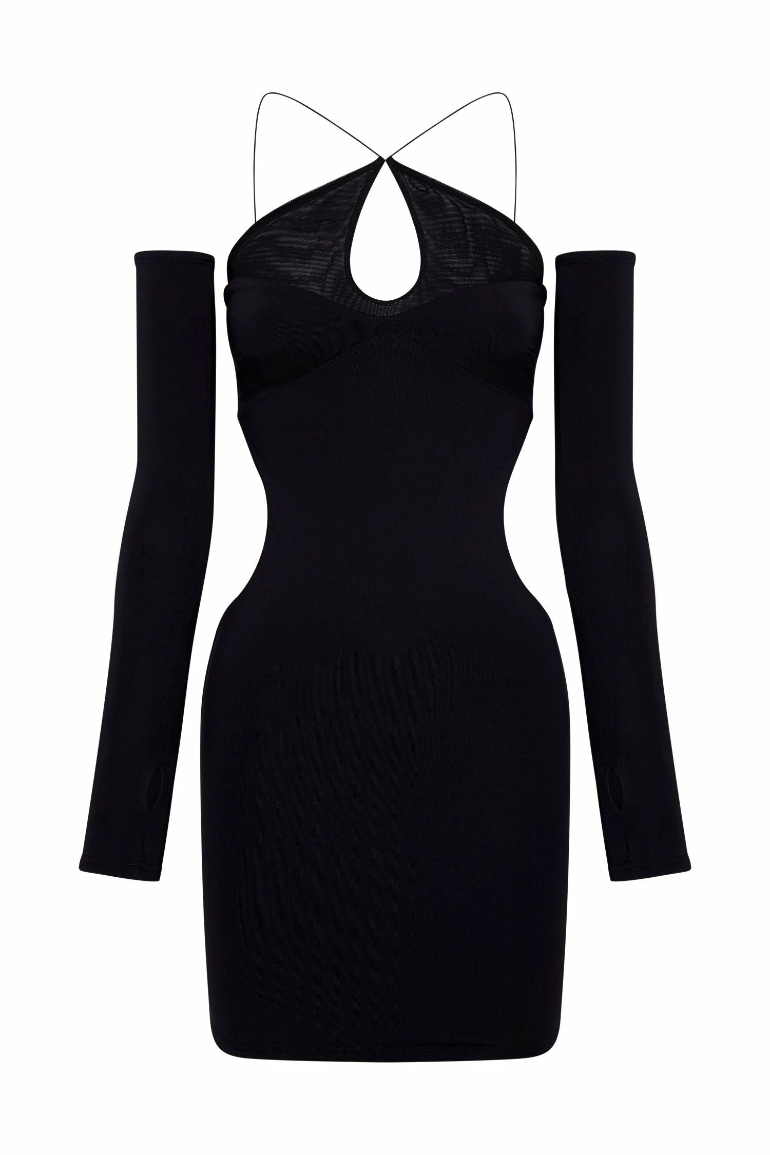 MADDY is a total sweetheart! She’s flirty, she’s feminine, and she’s unforgettable. Symmetrical side waist cut-outs shape the silhouette of a slightly-exaggerated – but no less flattering! – hourglass figure. Thin fabric ties keep the halter-top neckline secure. A beautiful teardrop cut-out in the middle of the chest adds a level of soft, elegant beauty. And, finally, slender fingerless gloves perfectly balance out the miniskirt cut. Maddy’s your go-to gal for a good time! Accentuate your slender calves in this outfit by donning a pair of gladiator sandals or our Neve Faux Leather Wrap Around Heels.