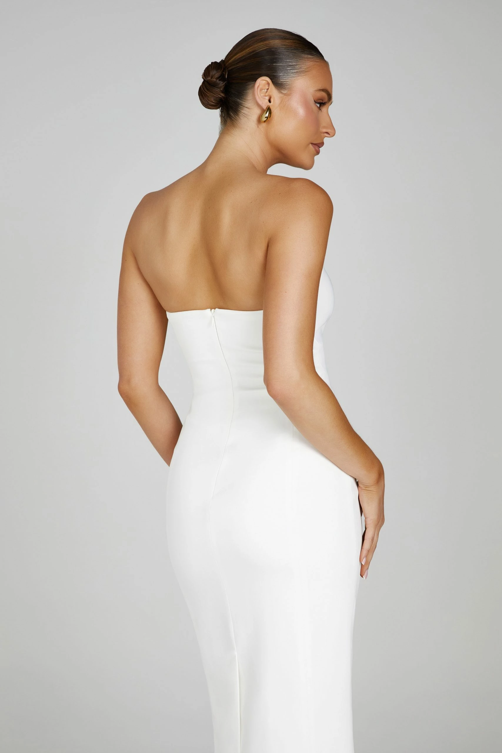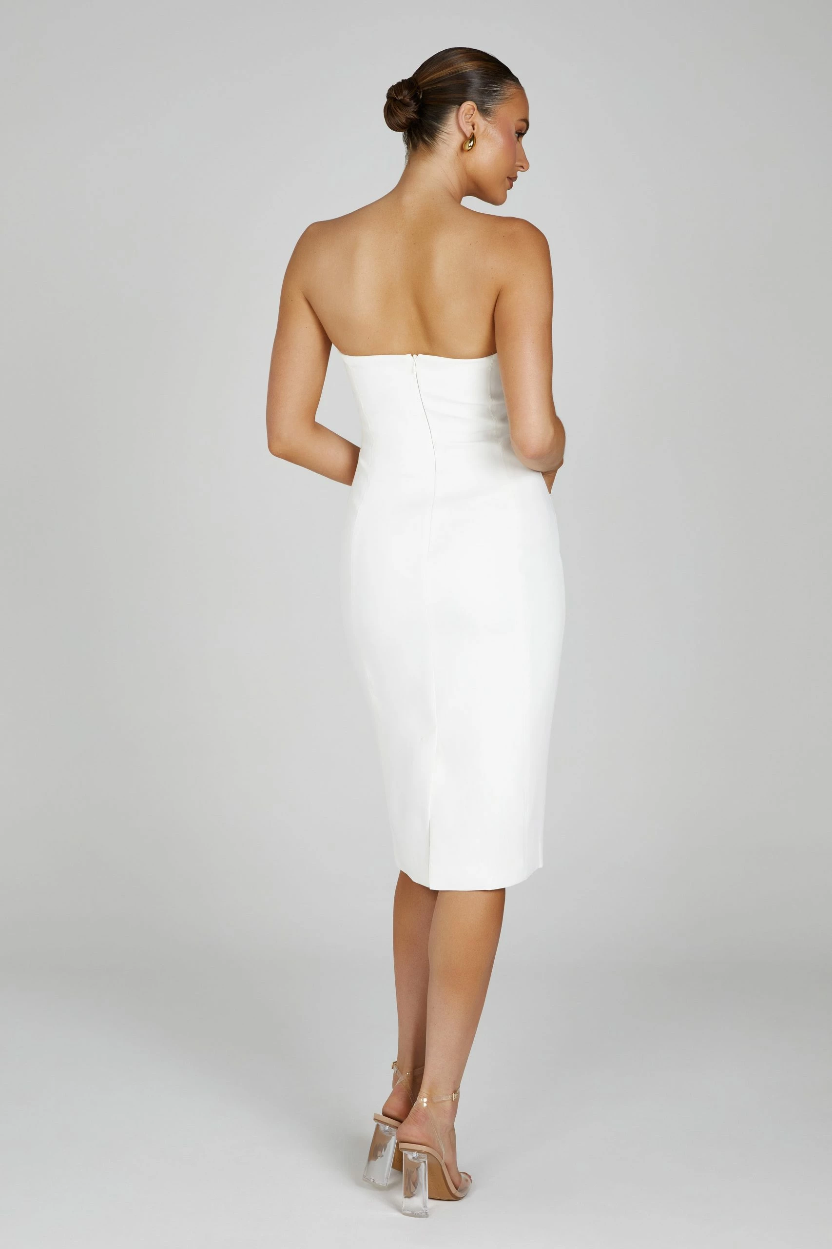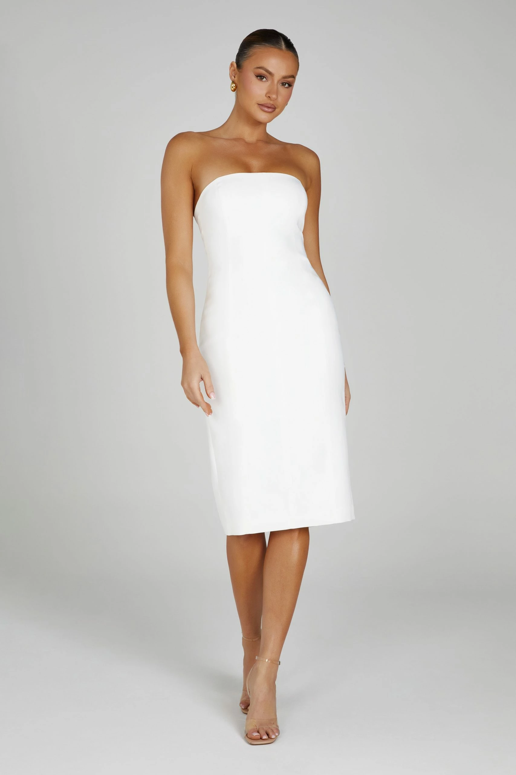 The MARIANNE is a midi dress crafted from our soft crepe fabrication. Designed in a shoulder-flattering strapless fit, the MARIANNE is perfect for effortless day-event dressing or add our Caitlin Diamante Heels to add glamour for the evenings out.