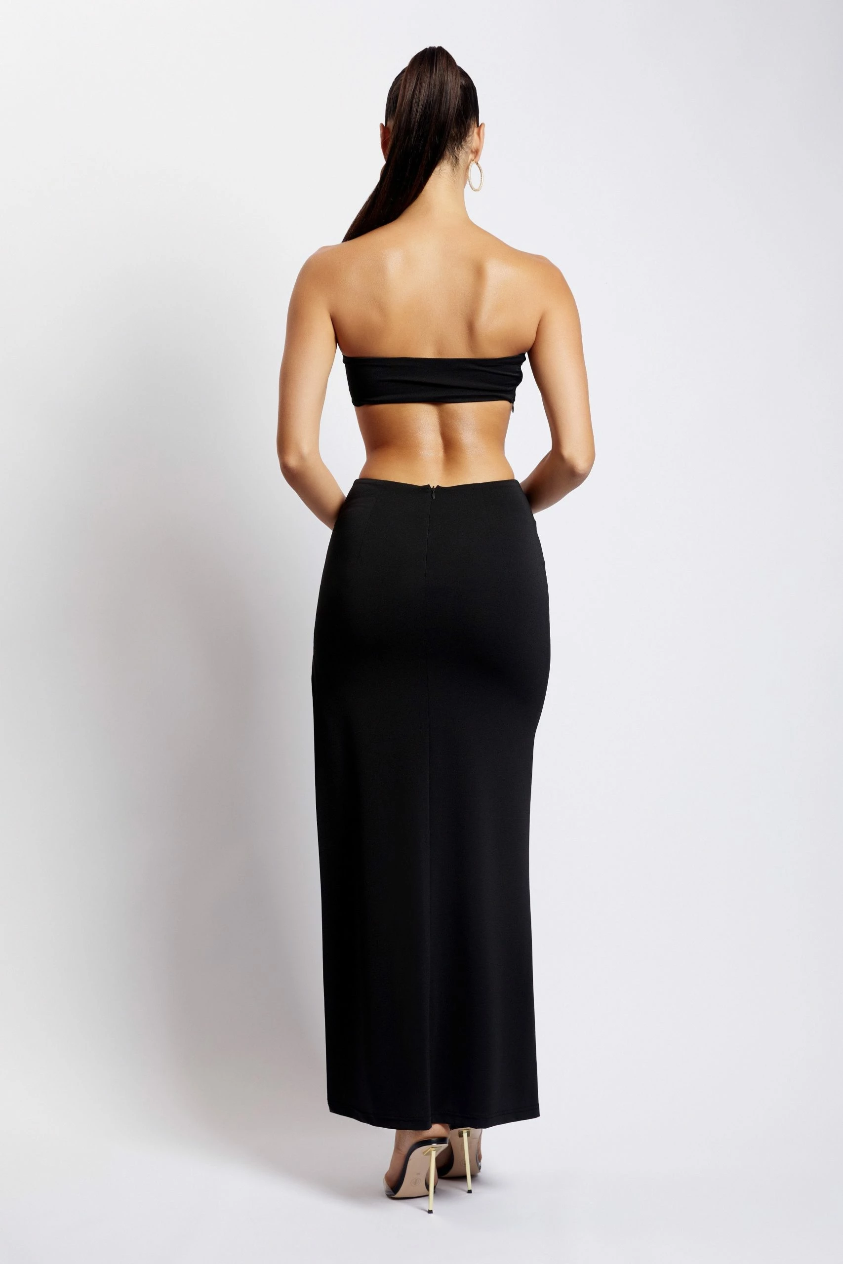 The MARISSA Strapless Maxi Dress With Waist Tie breaks free from the classic maxi with striking cut-outs that channel the fierce and feminine. She features a thigh-high split that is sure to turn heads and is crafted from a crepe fabrication that hugs your body in all the right places. Complete the look with a bold lip and statement earrings for a flawless finish.