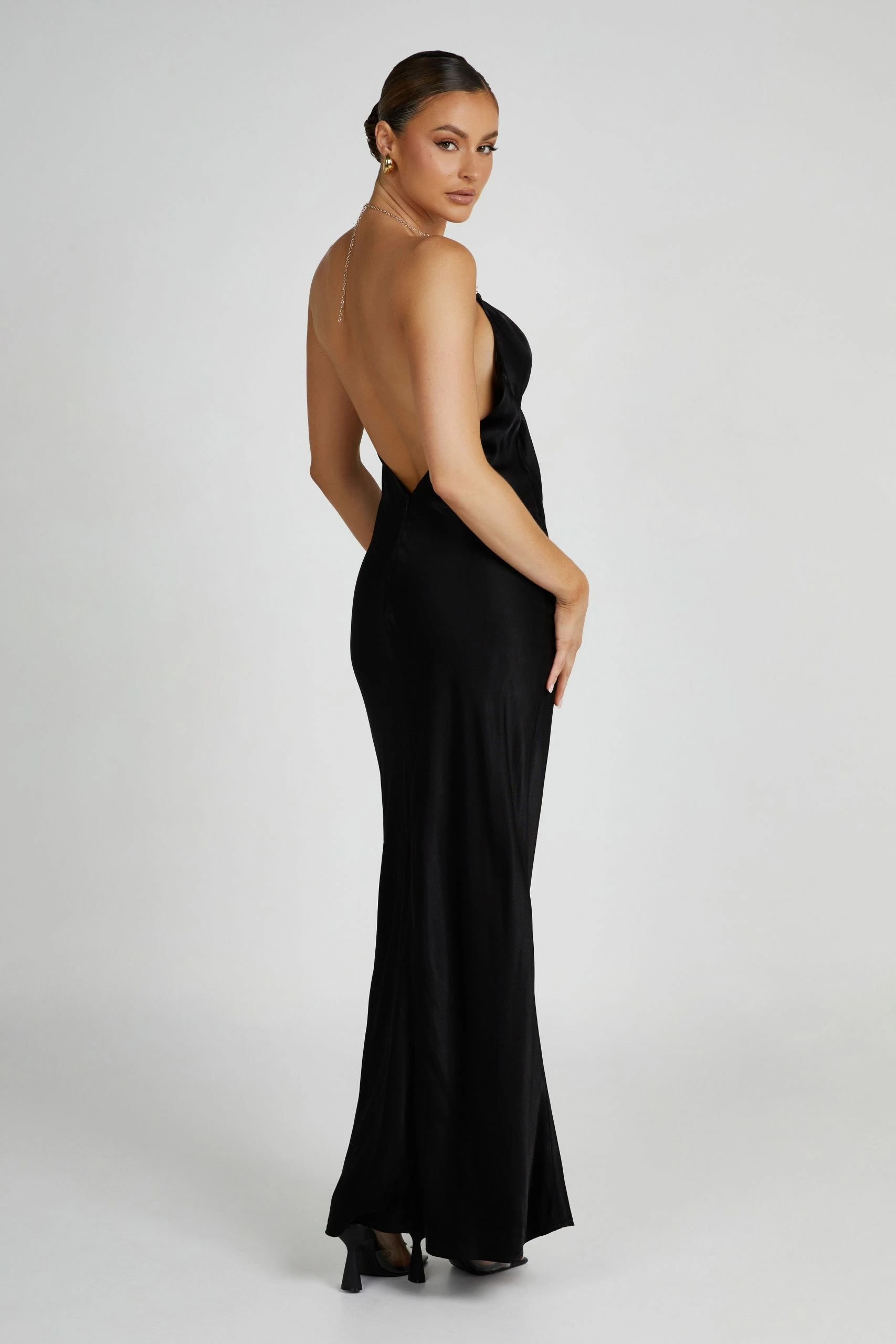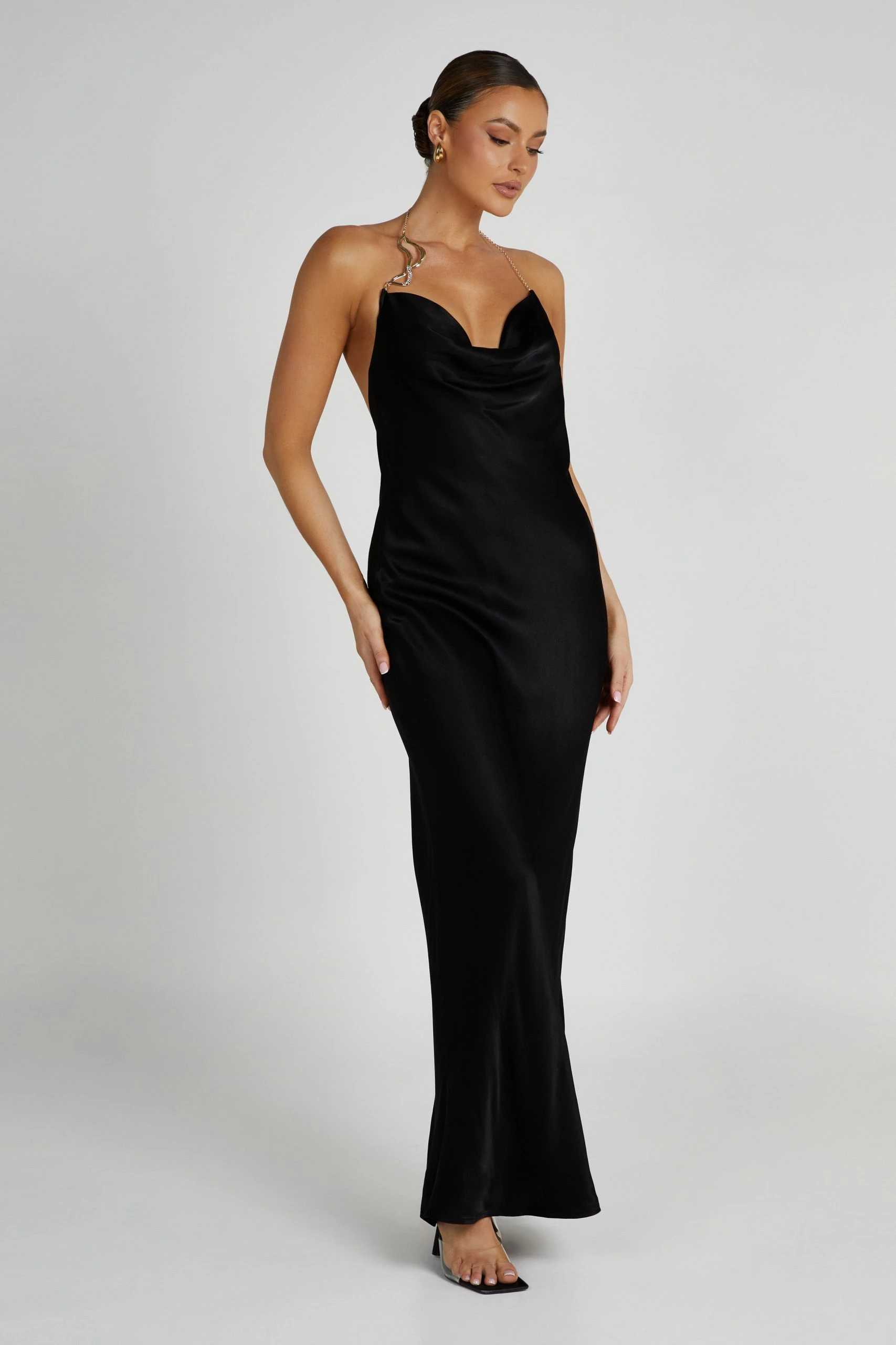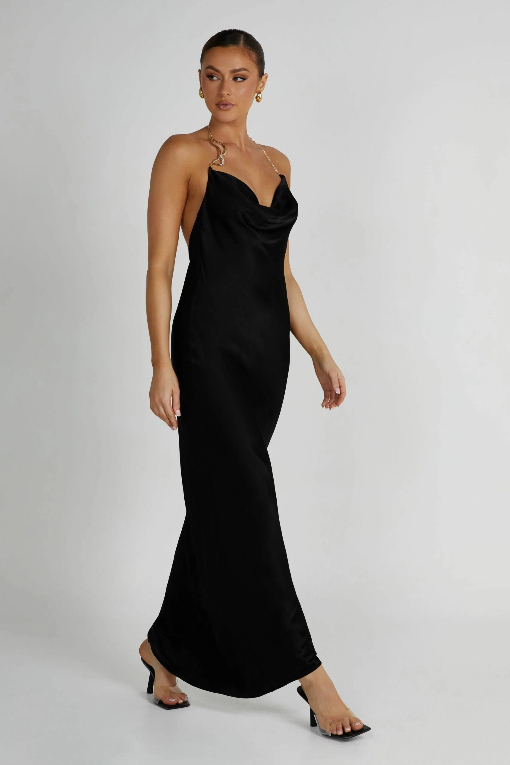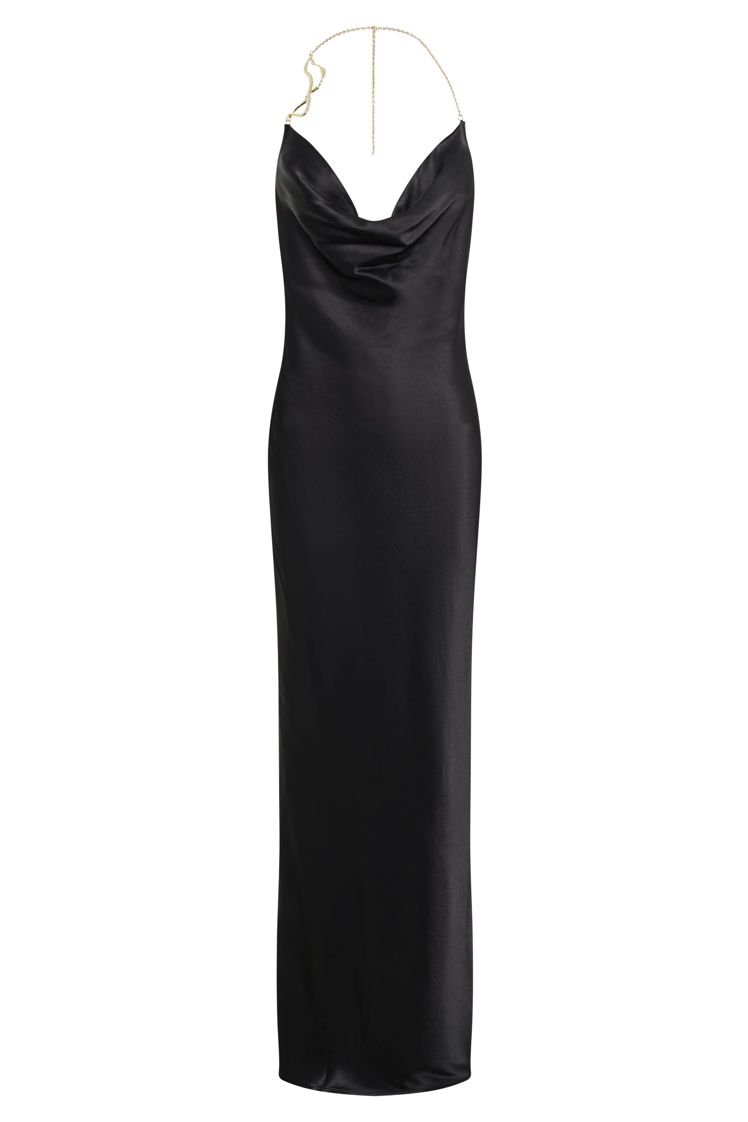 Showcasing a soft cowl neckline and elegant open back, MELISSA is adorned with exclusive MESHKI hardware detailing that allows for an adjustable, custom fit. Pair with our Monroe Criss Cross Heels to complete the look.