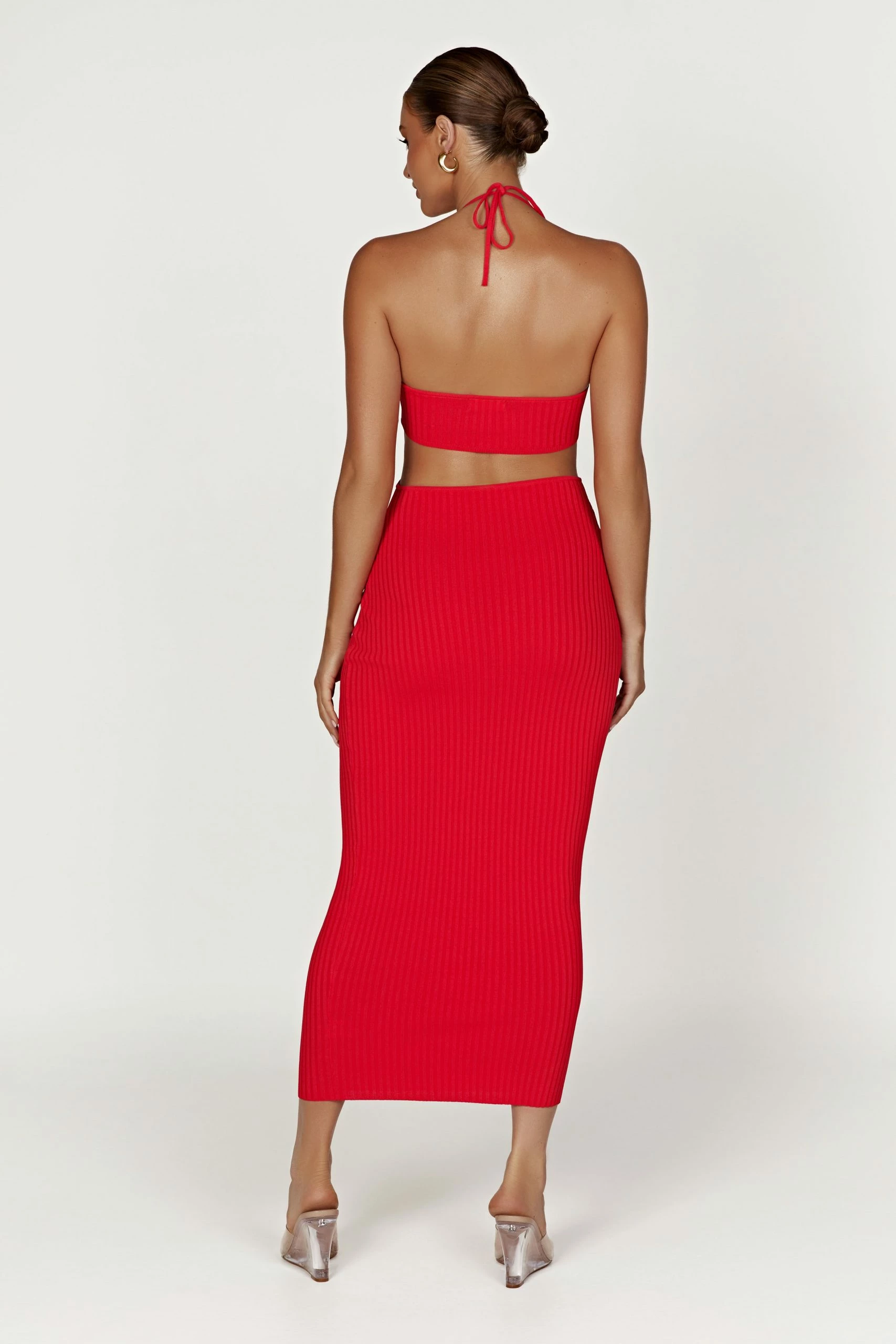 The MORGAN is an elevated take on the classic midi dress, incorporating a flattering halter strap fit and a hint of cut out along the back. Crafted from our body-hugging MESHKI blend fabrication, it delivers a close-knit fit with enough stretch to deliver ease of movement. Wear with our Brandy Ankle Strap Heels to complete the look.