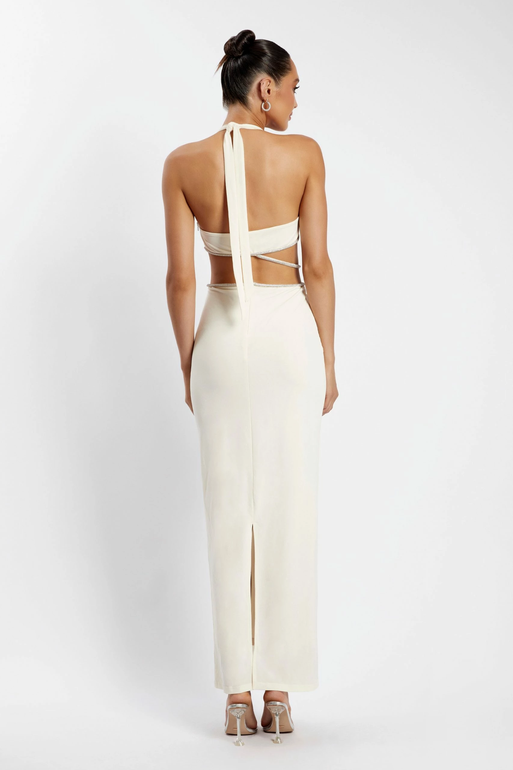 The NICHA Diamante Cut Out Midi Dress is the epitome of evening elegance. Fitted in its form, Nicha features a flattering plunge neckline and architectural waist cut-outs – complete with a finishing touch of diamantes to take your look to the next level. She offers a centre-back split for unrestricted movement and is fully lined for comfort. Complete the look with a sleek bun and minimal accessories for your next glam function.