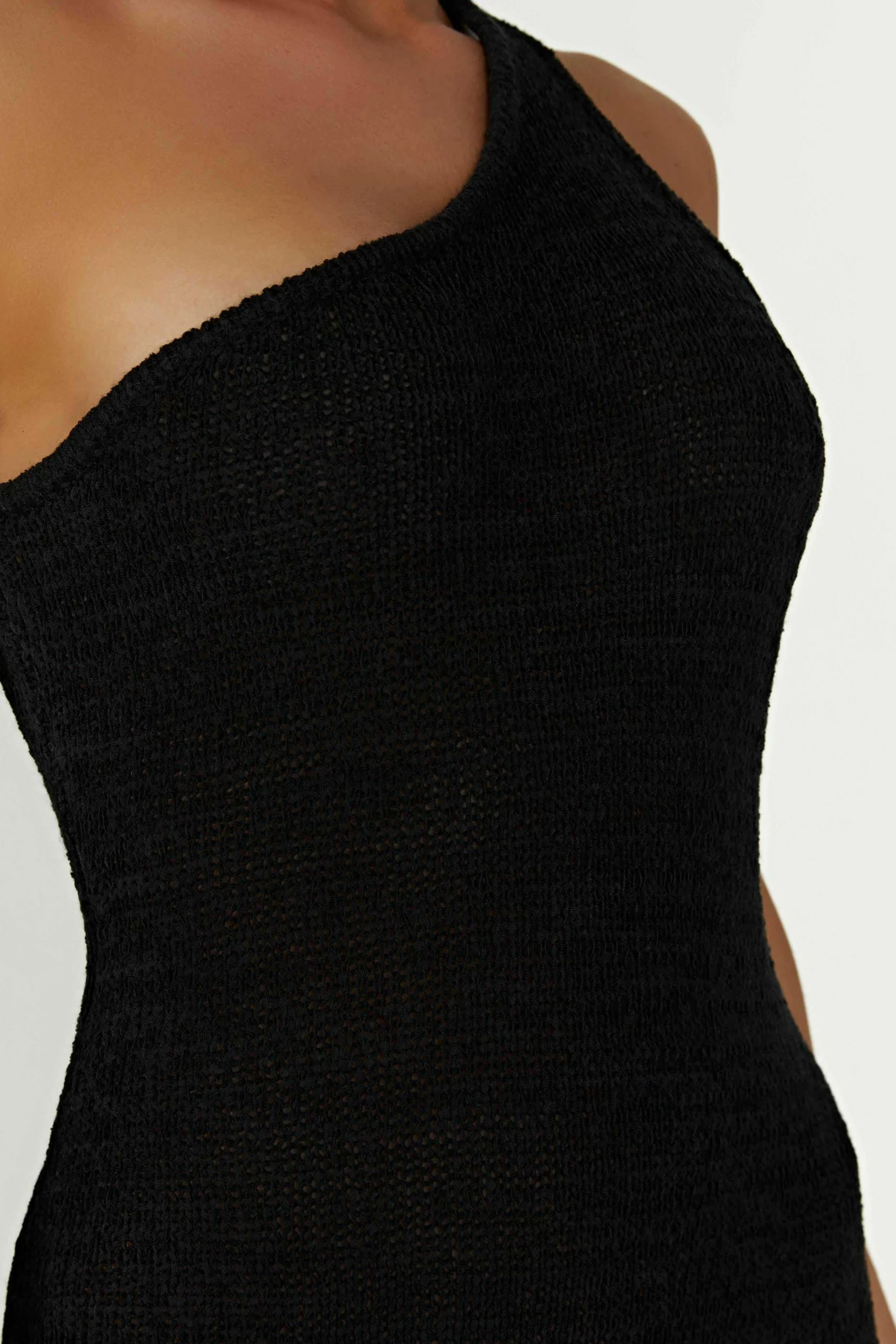 This knit maxi dress features beautiful asymmetry to the front and back. The front single shoulder strap stretches back into a low-cut backline that cuts across the right and dips into a round open back on the left. The soft fabric with knit detailing adds further visual texture that complements the fit overall while the hem drops to the floor in classic maxi dress design. Style with neutral accessories to complete the look.