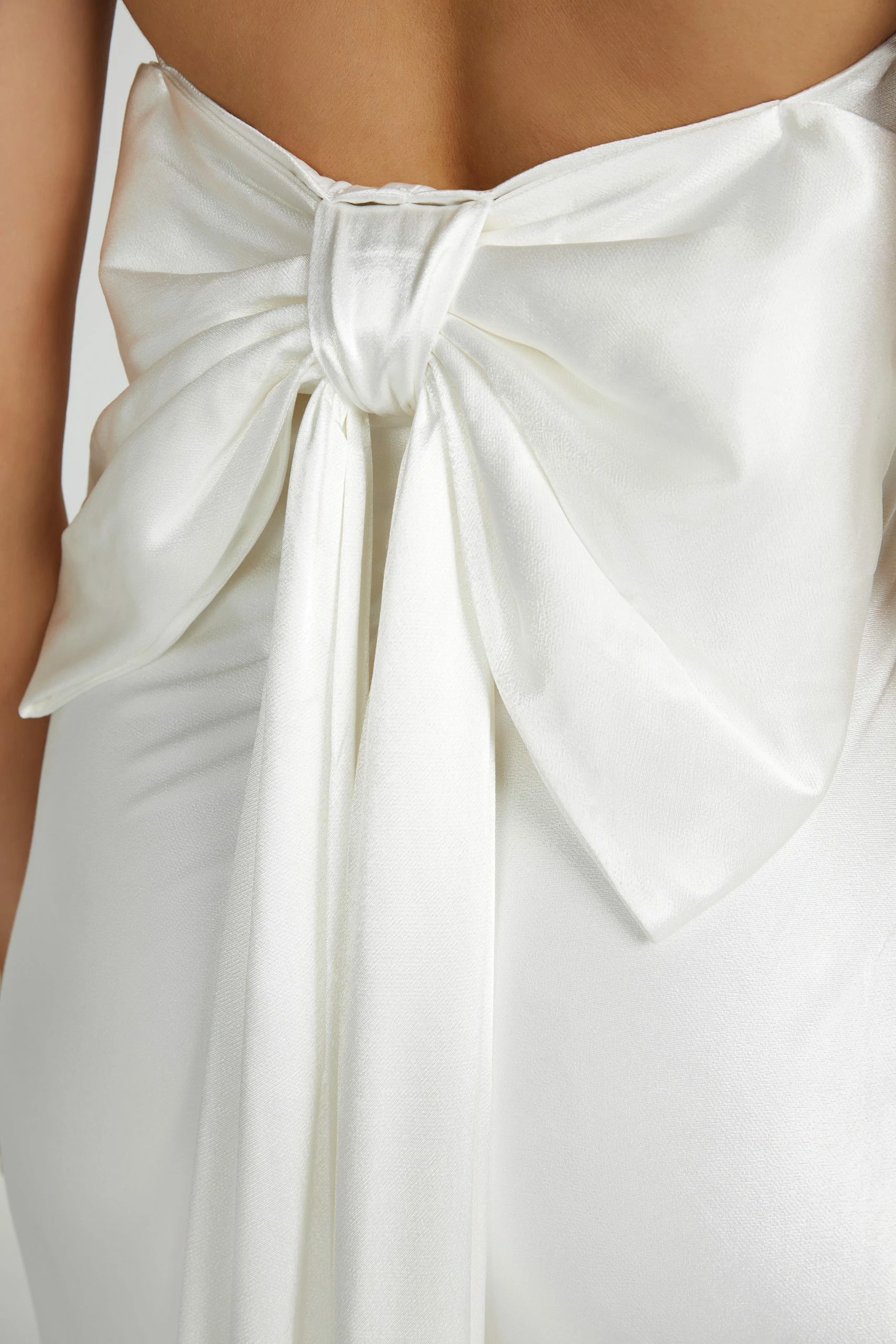 This is a strapless maxi dress made of soft, metallic satin. At the small of the back sits a large self-tie bow as an accent piece. The neckline is a straight, low-cut affair that shows off a hint of cleavage for some light teasing. The satin-metallic fabric drops and flows along the curves of the body, ending in a fairly loose hem that hangs lower than the ankles. Its rich colour and daring silhouette makes for an eye-catching evening attire that stuns! Pair with the Neve Wrap Around Faux Leather Heels to complete the look.