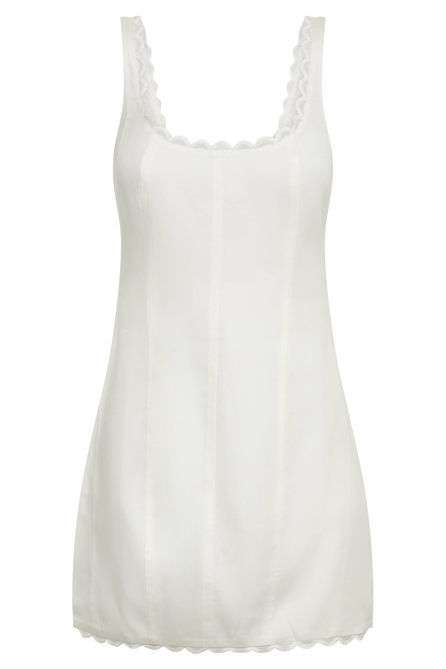 This is a sleeveless cotton corset mini dress with lace trim details around the neckline, hemline, and shoulder straps. Its tencel-linen fabric composition coupled with the back invisible zipper creates a snug, bodycon fit while the vertical lines further add to the corset-style effect. Wide shoulder straps and polyester-elastane lining keep you comfy and secured, 24/7. Finish the outfit with strappy sandals or heels, like our Monroe Criss Cross Heels.