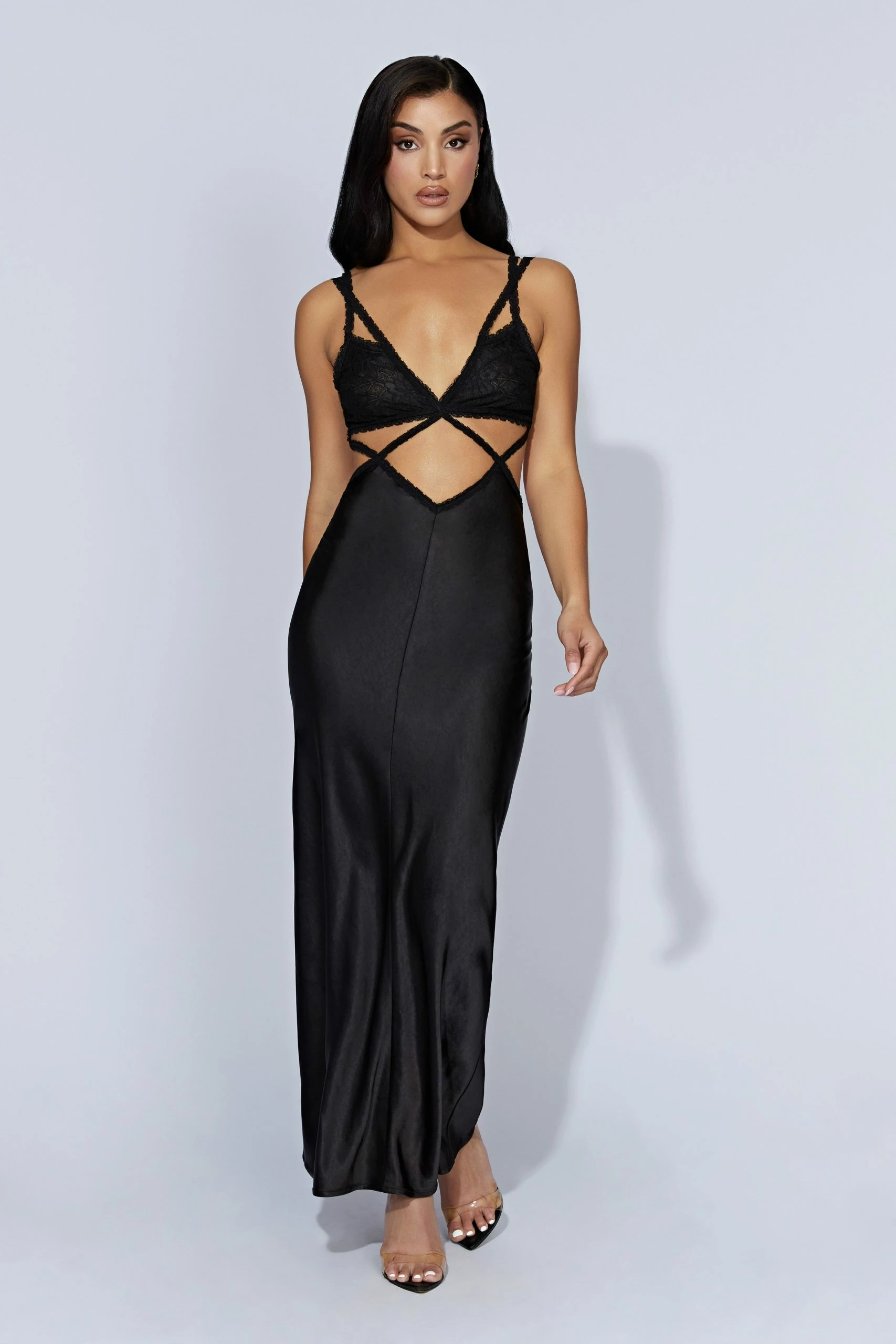 Transcend from daytime decadence to after-dark antics in SERAPHINE. She’s a real crowd pleaser — designed to set you apart with her delicate lace accents and figure-enhancing cut outs. Showcasing a plunge V neckline to highlight your décolletage, Seraphine is just as striking from behind with her open back and gold clasp closure. Exude understated elegance by styling with our Neve Faux Leather Wrap Around Heels and a bold lip.