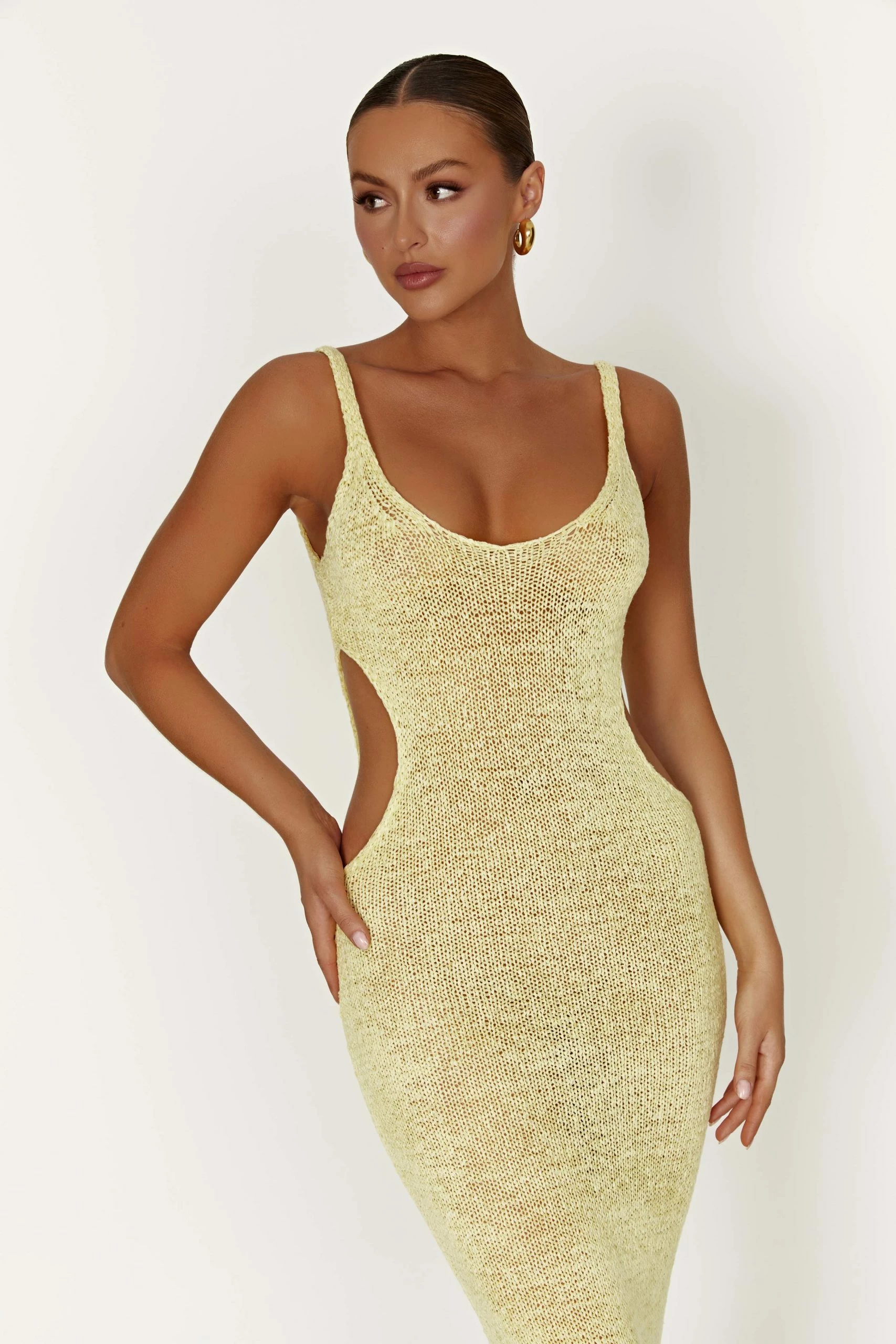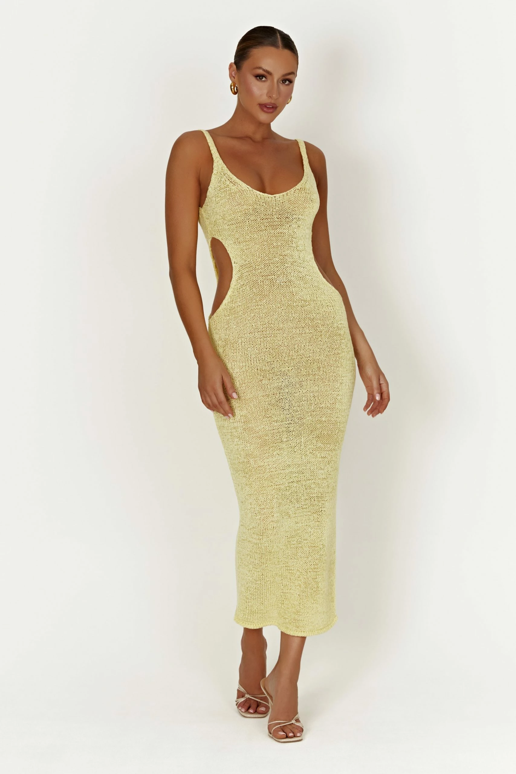 Long, slender, and snug to all the right curves, SHAE’s proud of your figure and wants you to flaunt it loudly. Strategic side cut-outs accentuate your waist while a classic (but teasingly low) scooped neckline shows off your delicate décolletage. Pair her with our elegant Brandy Ankle Strap Heels.