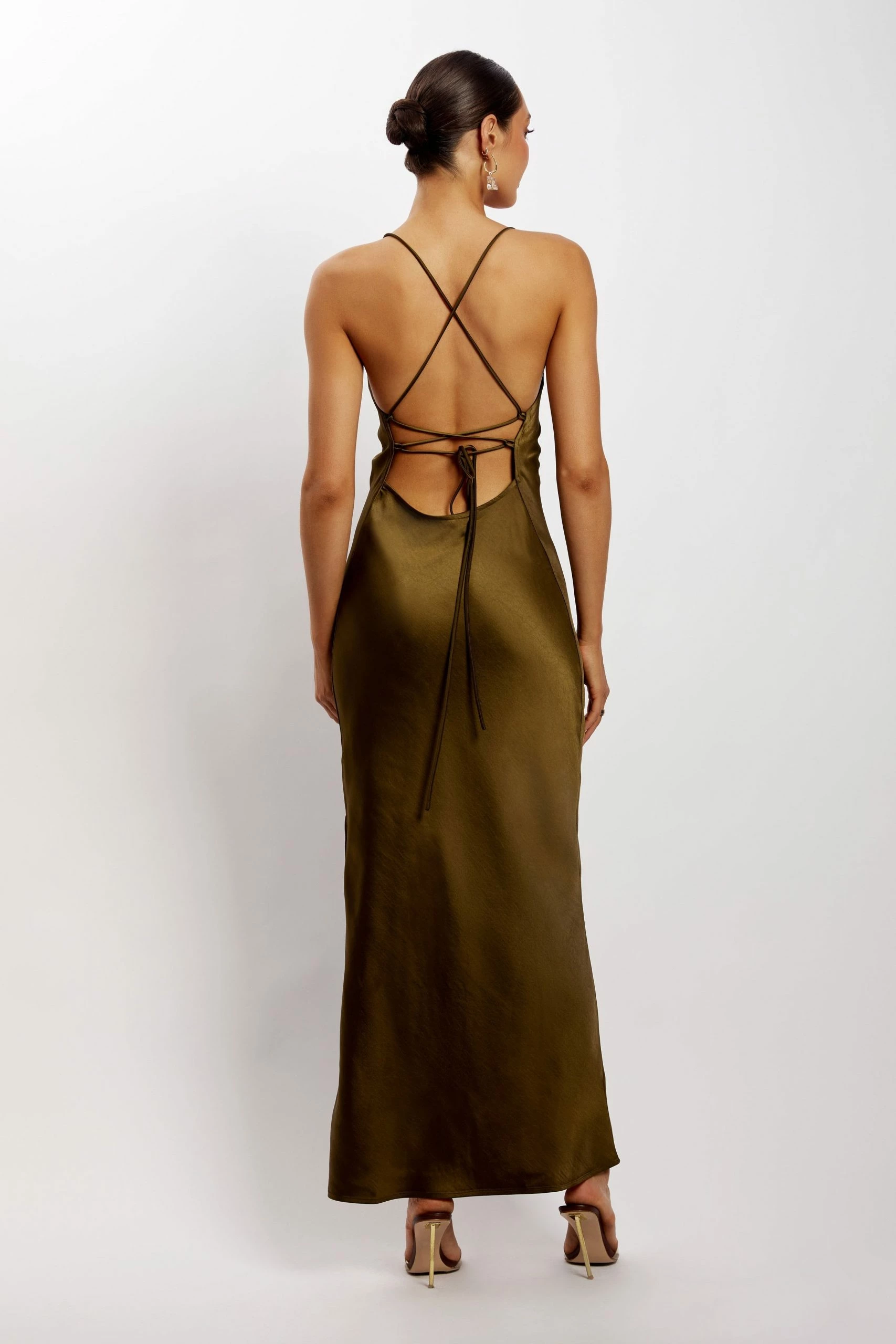 An understated and elegant silhouette for the modern muse. The much-loved SYDNEY Straight Neck Slip Maxi Dress returns in a fresh hue for a season of celebrations. Boasting a squared neckline and head-turning open back, this midi features a cross back design with a self-tie feature for a customised fit. Team with barely-there heels to keep Sydney in the spotlight.
