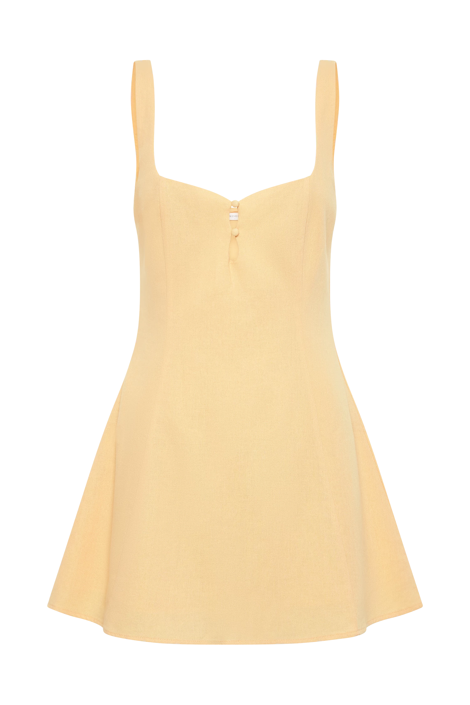 TANDIE is a linen flare mini dress designed to feel breezy and romantic. It has a soft, sweetheart neckline, wide shoulder straps, and a fairly low, flattering backline. The lined linen-viscose fabric ensures a light, comfortable fit. The front is decorated with two self-covered buttons while the flowing, flared skirt hem falls to mid-thigh. This dress’ side zipper is neatly sewn into the hem for that clean, seamless silhouette. Match with an oversized straw tote for an easy warm-weather look.