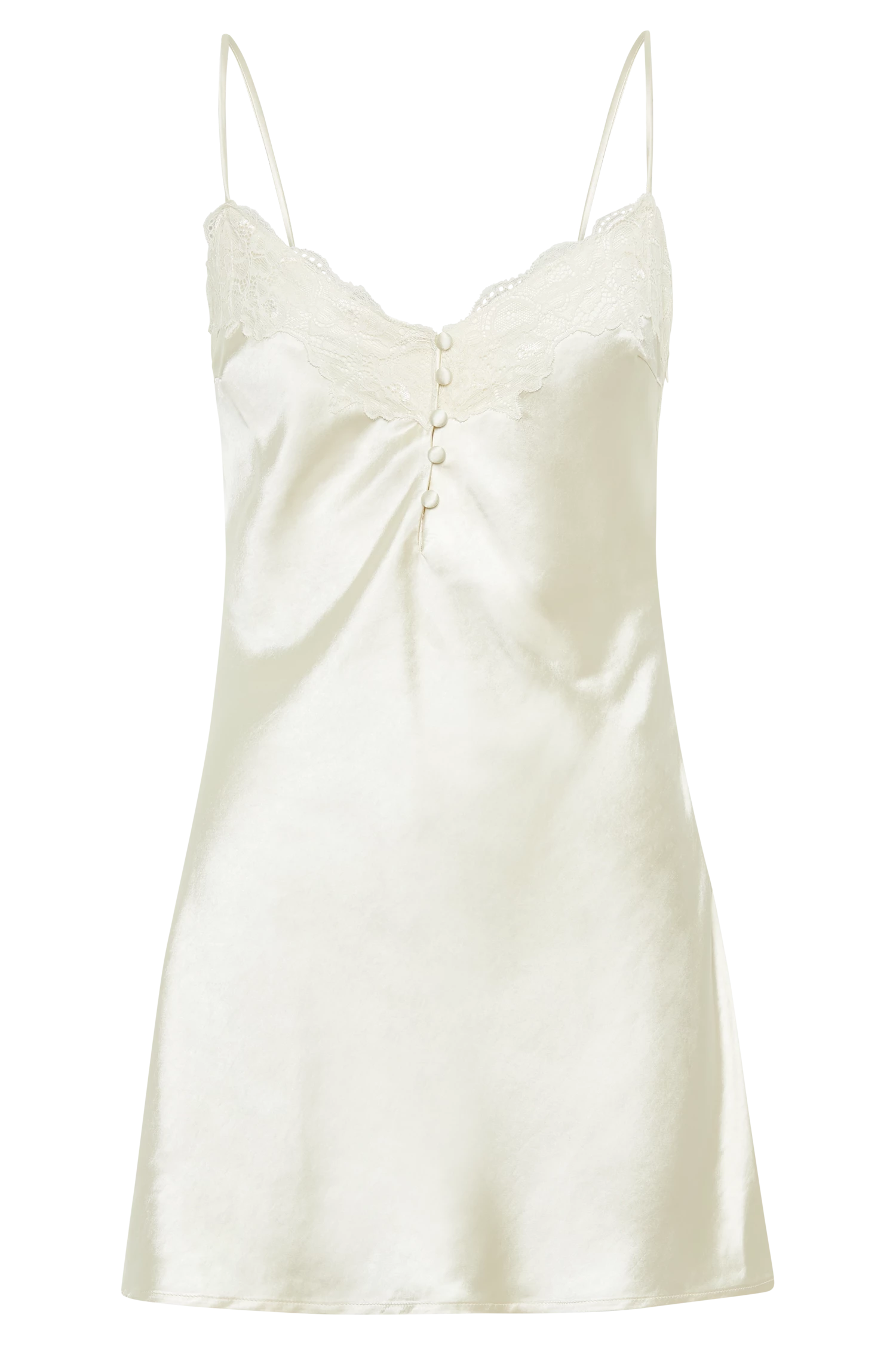 VESTA is an alluring satin sleeveless mini dress with thin shoulder straps, a sweetheart neckline, and a fluted hem with delicate scallop lace trimming throughout. The front centre closure is lined with satin-covered buttons while the shoulder straps are adorned with light gold strap adjusters. Plus, both the lace and satin are made of our soft MESHKI blend fabric, guaranteeing soft, comfortable wear.Â
