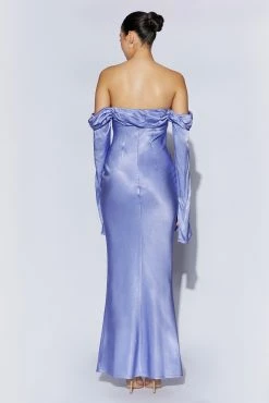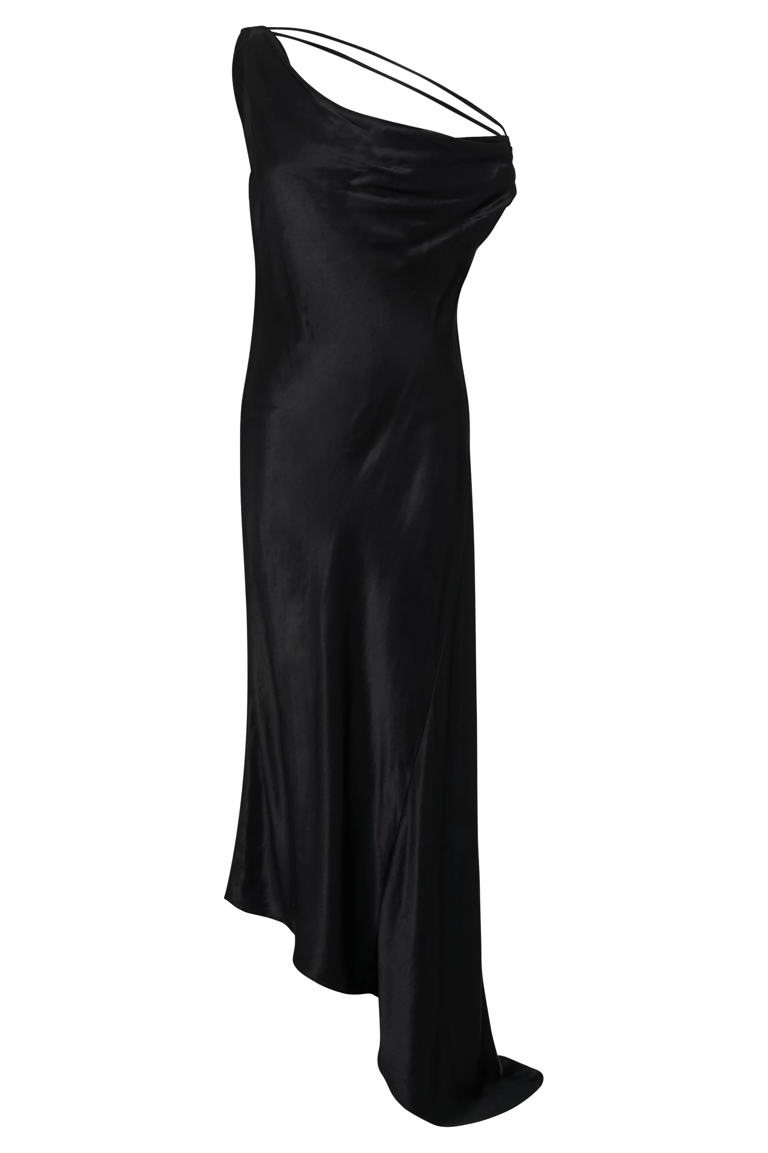 YVETTE is a Slip Maxi Dresss with a low, open back, a slight cowl detail for the front neckline, and a loose, flowing hem. The front neckline dips into a slanted arrangement, with one shoulder strap up for a sleeveless look and the other down in an off-shoulder style. The asymmetrical hem is much the same, with one part gathered above the ankle and the other hitting the ground. Two thin fabric straps run across the back, adding extra detail to the low, back neckline.Â