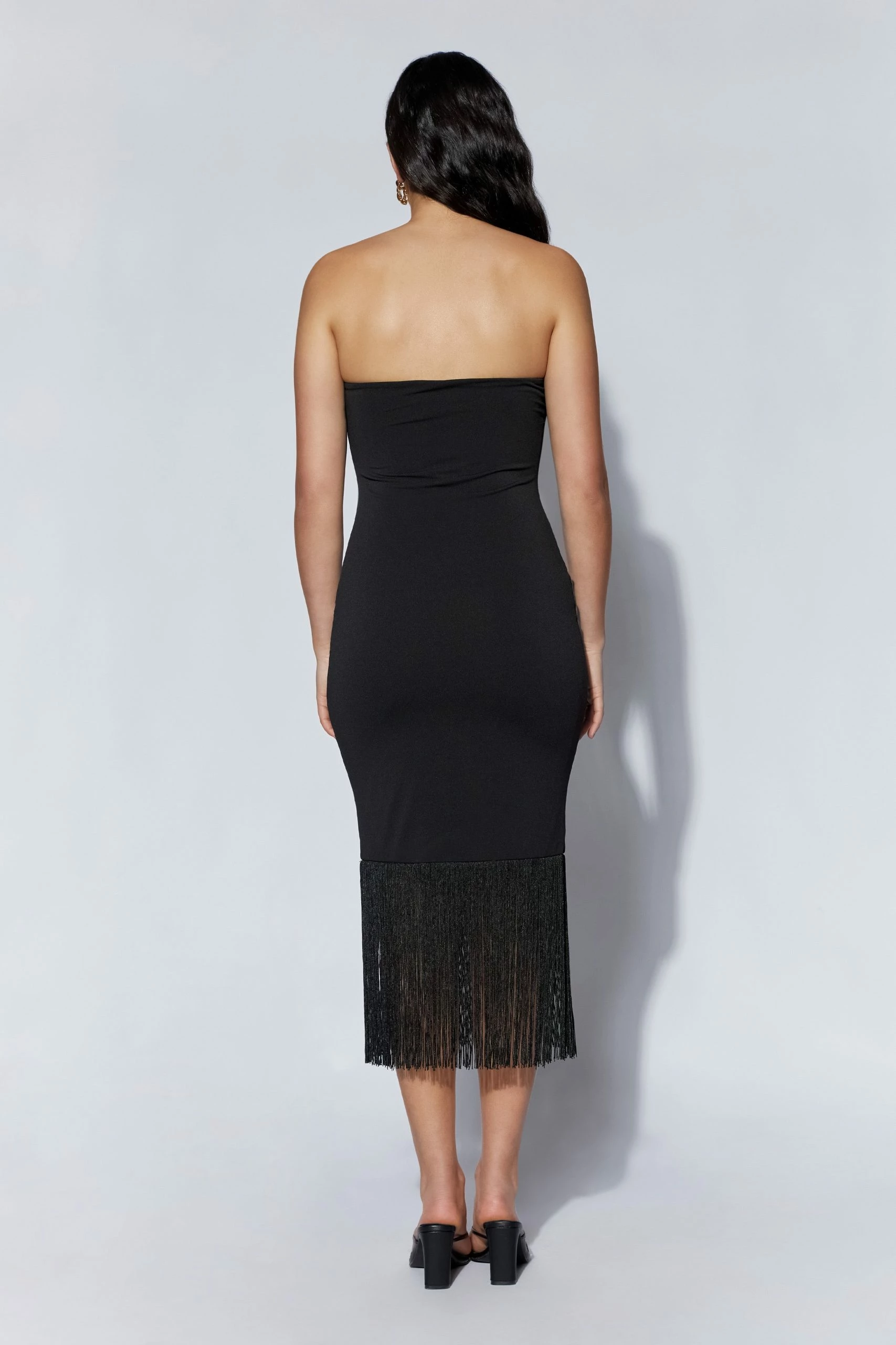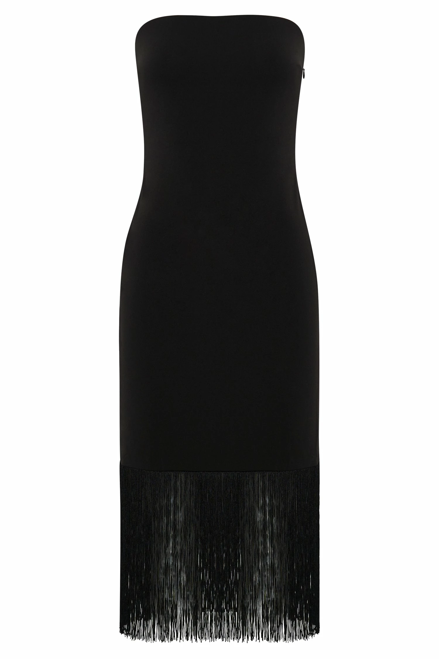 You’re a queen worthy of attention, and ZARINA completely agrees! Bold, bright, and absolutely stunning, she’s the perfect match for your graceful, confident self. Flaunt your gorgeous figure in this strapless midi dress, cut to cling to – and highlight – slender lines and generous curves. The strapless cut shows a hint of your daring personality whilst the long fringe adds an exotic, playful flair. Feel free to party the night away, beautiful; ZARINA’s polyester-spandex lining will keep you tucked and trim, no matter what! Complete your dusk-til-dawn look with sultry winged liner, a glossy lip, and our Caitlin Diamante Rope Heels.